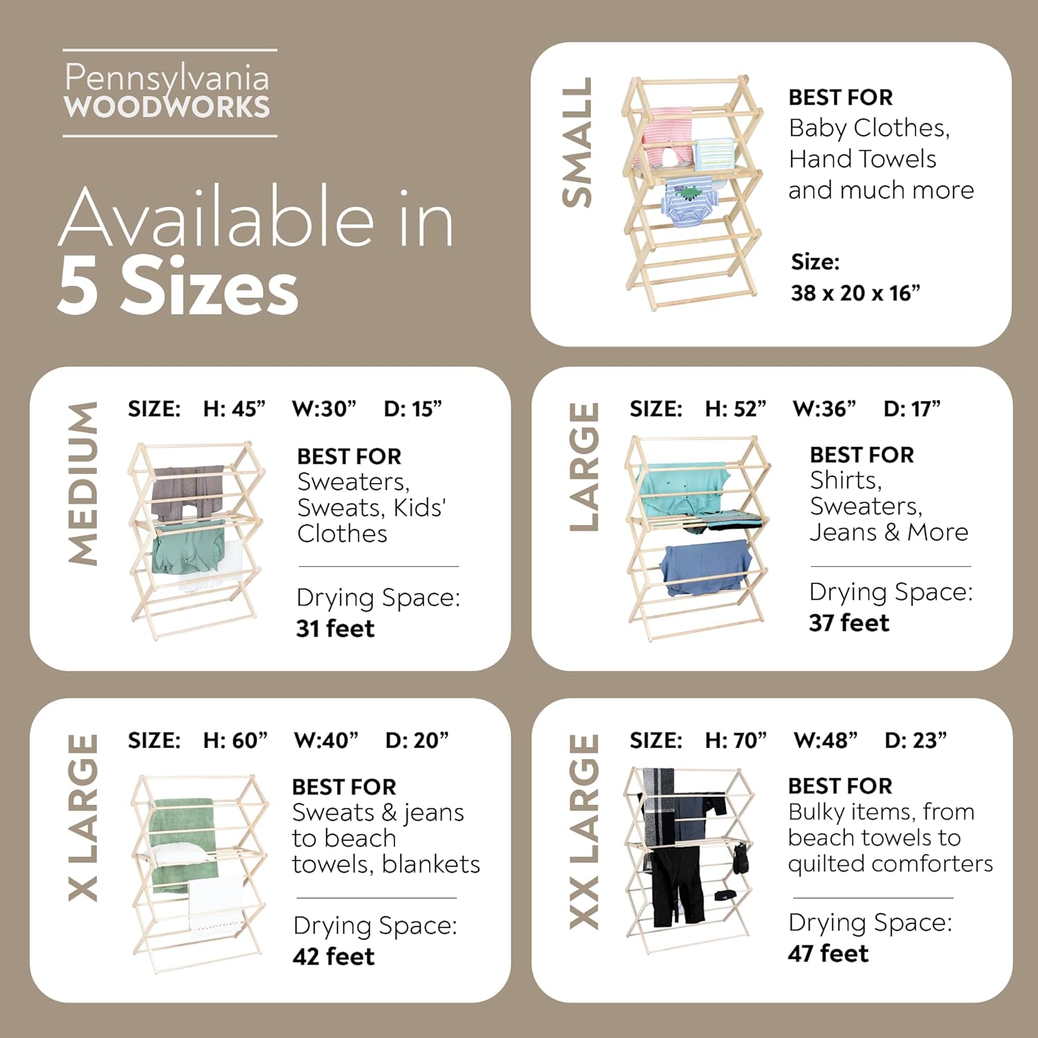 - 42 Feet of Drying Space: At 60 inches high x 40 wide x 20 deep (expanded), this extra-large folding drying rack easily handles anything from sweats & jeans to beach towels, blankets & bedding.