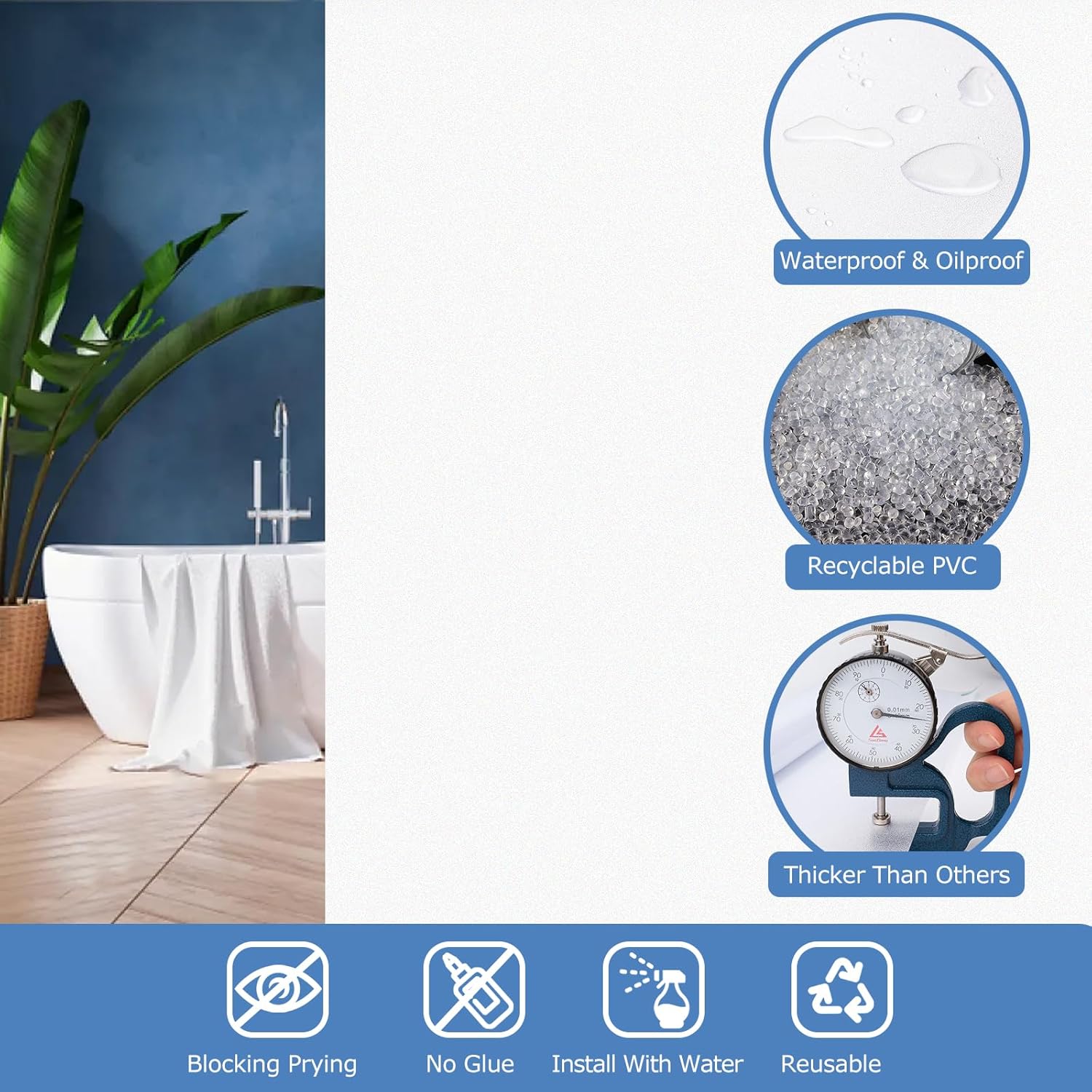 - NO GLUE & Reusable: No glue design keeps you away from the trouble of toxic chemical glue. Static cling window film is easy to install and remove without any residue. More important, you can remove and use it again. The more water you use, the firmer the privacy window film will stick, soapy water is better. For more information on how to install privacy window film, you can refer to our detailed page.