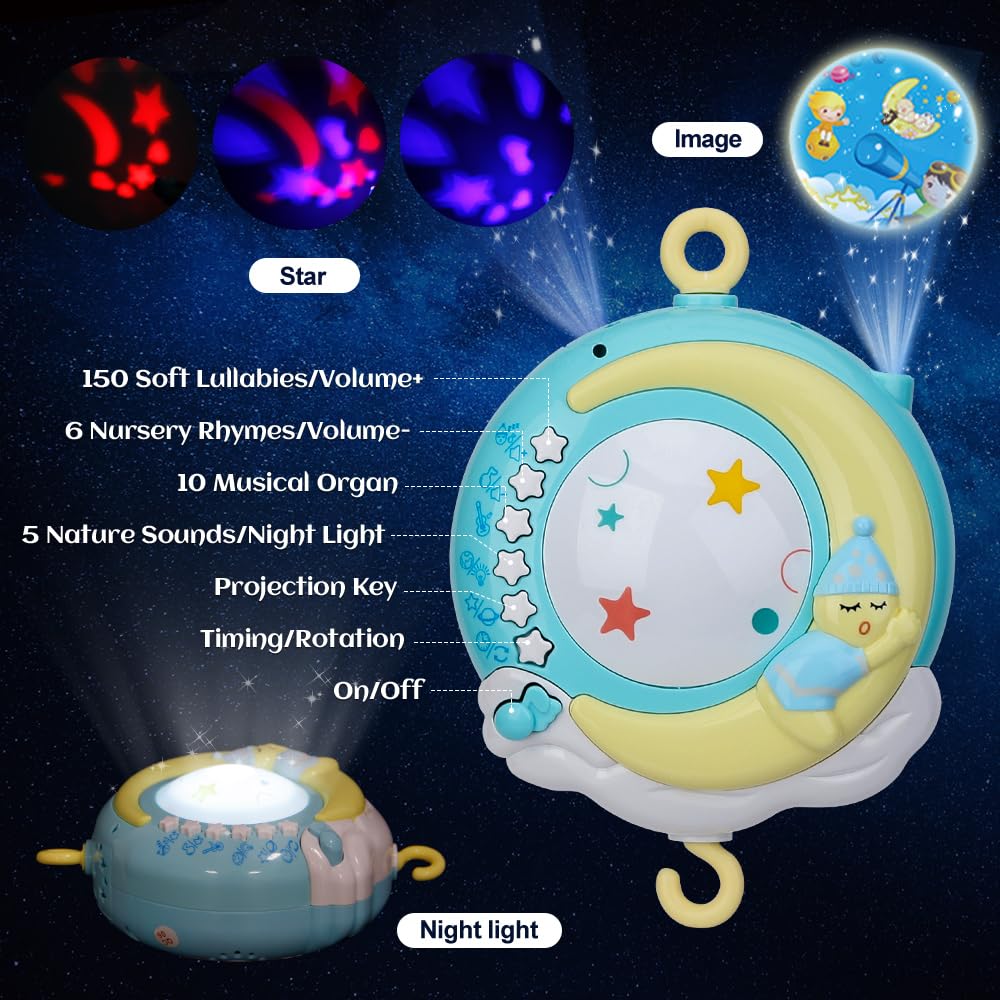 - Projection and Night Light - Mobile for crib has star lights and image 2 kinds of projection 4 scene modes.Night Light with sweet music or sounds playing along, help comfort your baby during quiet times or nap time,makes baby feel safe at night