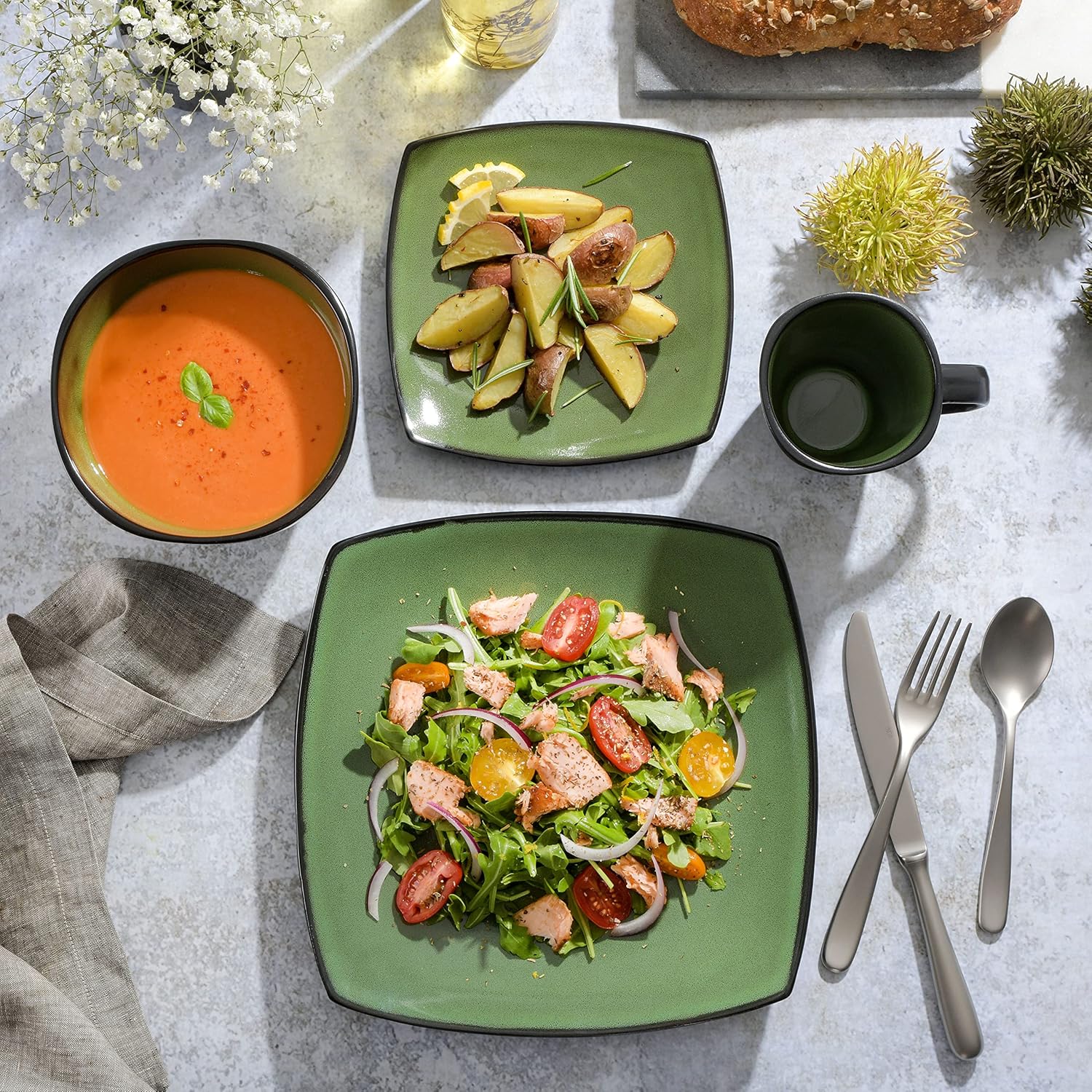 - CONTEMPORARY DESIGN: artisanal reactive glaze featuring natural organic hues creating a modern elegance to the dinnerware set. The durable stoneware and reactive glaze make these sets difficult to scratch and break