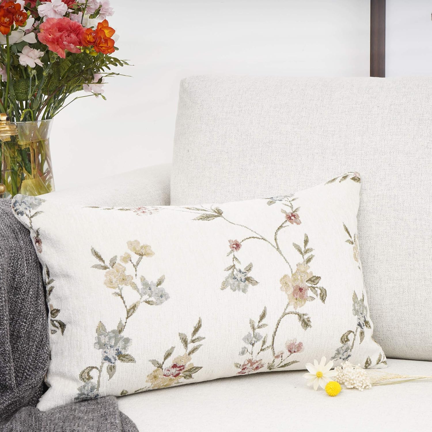 YOUR SMILE Classical Embroidery Jacquard Farmhouse Oblong Rectangle Chenille Beige Floral Pattern Decorative Throw Pillow Case,12x20 inch