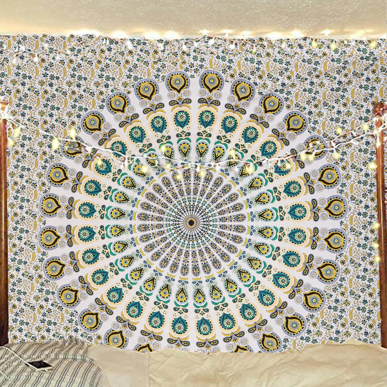 Bless International Handmade Indian hippie Bohemian Psychedelic Peacock Mandala Wall hanging College Dorm Beach Throws Table Cloth Bedding Tapestry (Yellow Green, Queen(84x90Inches)(215x230Cms))