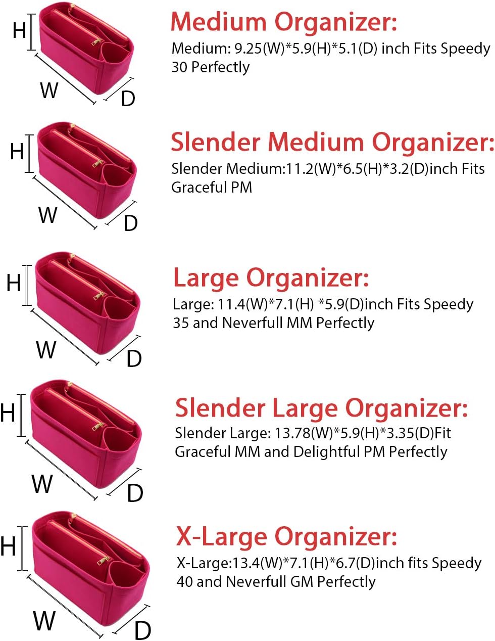 - SIZE OF BAG ORGANIZER: Medium: 9.25(L)*5.9(H)*5.1(W) inch Fits Speedy 30 Perfectly. Slender Medium: 11.2(L)*6.5(H)*3.2(W)inch Fits Graceful PM. Large: 11.4(L)*7.1(H) *5.9(W)inch Fits Speedy 35 and Neverfull MM Perfectly. Slender Large: 13.78(L)*5.9(H)*3.35(W)Fit Graceful MM and Delightful PM Perfectly. X-Large:13.4(L)*7.1(H)*6.7(W)inch fits Speedy 40 and Neverfull GM Perfectly. Portable and Compact Purse Perfectly For any Brand.L*H*W means (Length*Height*Width)