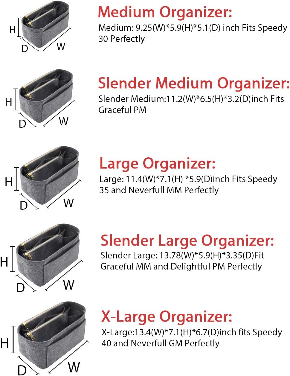 - SIZE OF BAG ORGANIZER: Medium: 9.25(L)*5.9(H)*5.1(W) inch Fits Speedy 30 Perfectly. Slender Medium: 11.2(L)*6.5(H)*3.2(W)inch Fits Graceful PM. Large: 11.4(L)*7.1(H) *5.9(W)inch Fits Speedy 35 and Neverfull MM Perfectly. Slender Large: 13.78(L)*5.9(H)*3.35(W)Fit Graceful MM and Delightful PM Perfectly. X-Large:13.4(L)*7.1(H)*6.7(W)inch fits Speedy 40 and Neverfull GM Perfectly. Portable and Compact Purse Perfectly For any Brand.L*H*W means (Length*Height*Width)