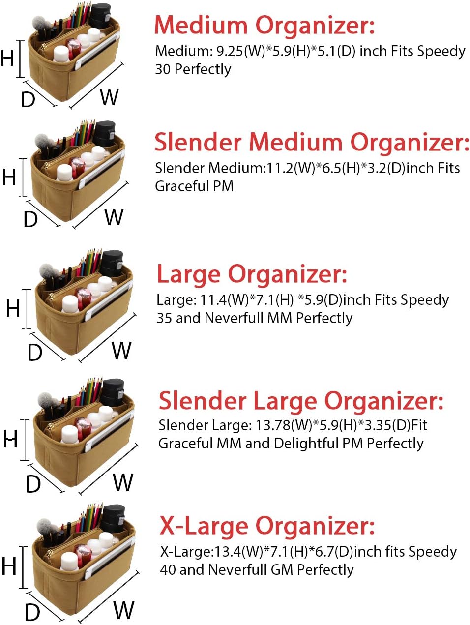 • SIZE OF BAG ORGANIZER: Medium: 9.25(L)*5.9(H)*5.1(W) inch Fits Speedy 30 Perfectly. Slender Medium: 11.2(L)*6.5(H)*3.2(W)inch Fits Graceful PM. Large: 11.4(L)*7.1(H) *5.9(W)inch Fits Speedy 35 and Neverfull MM Perfectly. Slender Large: 13.78(L)*5.9(H)*3.35(W)Fit Graceful MM and Delightful PM Perfectly. X-Large:13.4(L)*7.1(H)*6.7(W)inch fits Speedy 40 and Neverfull GM Perfectly. Portable and Compact Purse Perfectly For any Brand.L*H*W means (Length*Height*Width)
