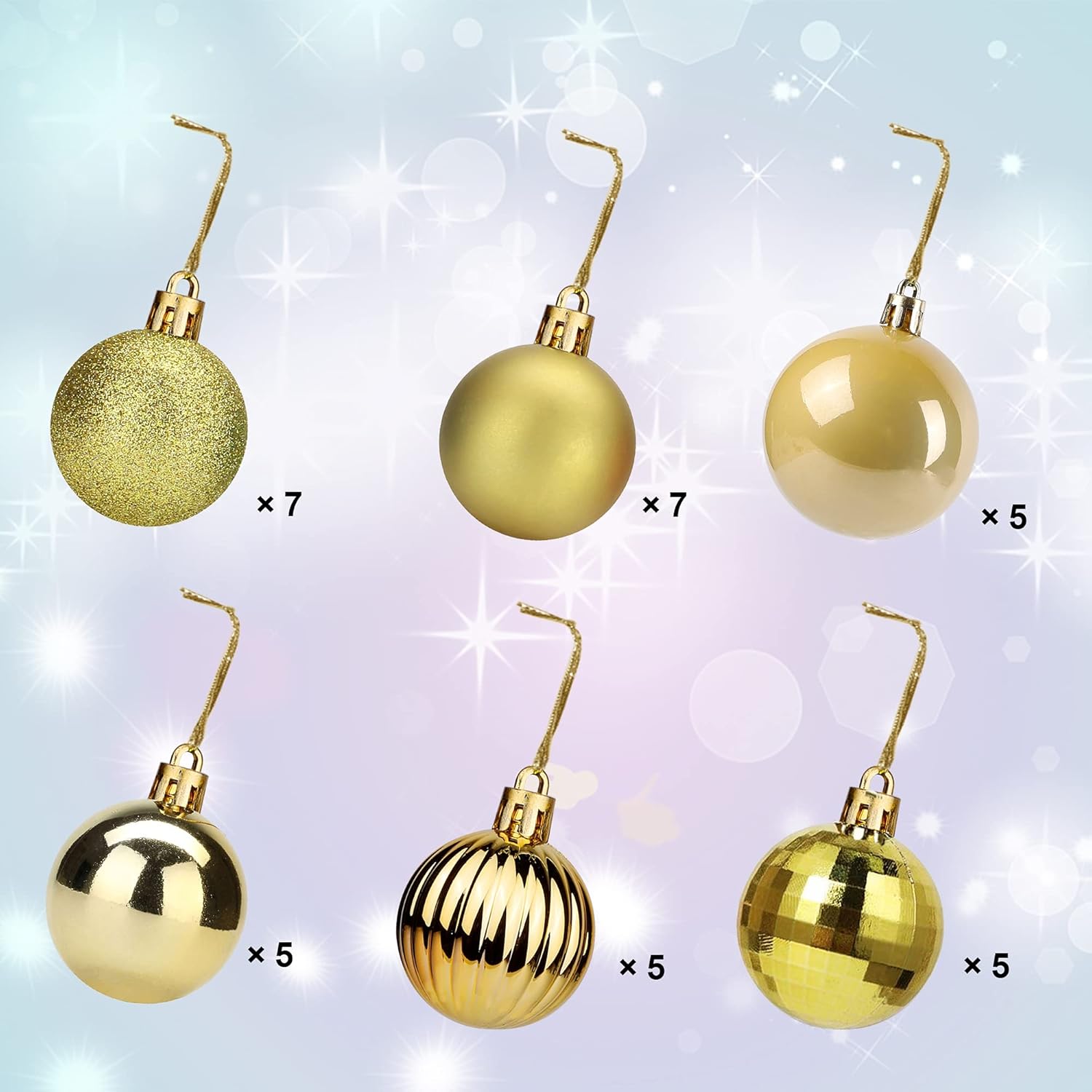 - CHRITSMAS BALL ASSORTMENT: Sized 1.57" in diameter, Lulu Home hanging balls are designed in 6 awesome surfaces: matte, glitter, shiny, mirrored, pumpkin-shaped and unique glass-looking. One package includes 34 balls in total, packed in a plastic container.