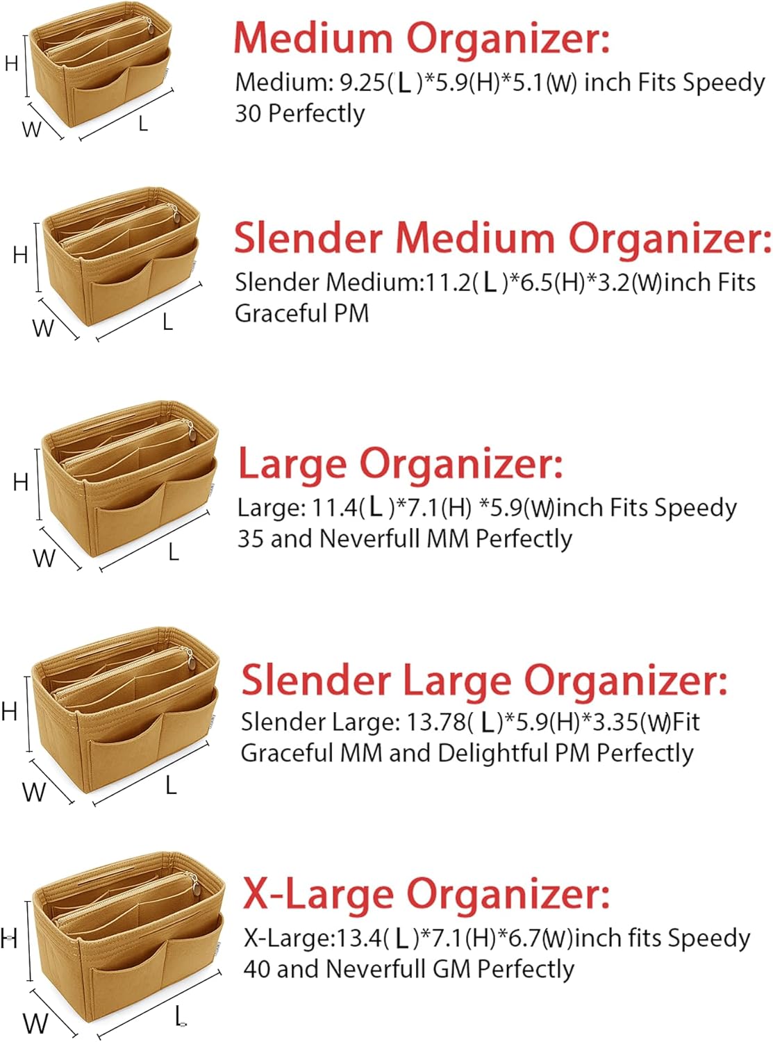 • SIZE OF BAG ORGANIZER: Medium: 9.25(L)*5.9(H)*5.1(W) inch Fits Speedy 30 Perfectly. Slender Medium: 11.2(L)*6.5(H)*3.2(W)inch Fits Graceful PM. Large: 11.4(L)*7.1(H) *5.9(W)inch Fits Speedy 35 and Neverfull MM Perfectly. Slender Large: 13.78(L)*5.9(H)*3.35(W)Fit Graceful MM and Delightful PM Perfectly. X-Large:13.4(L)*7.1(H)*6.7(W)inch fits Speedy 40 and Neverfull GM Perfectly. Portable and Compact Purse Perfectly For any Brand.L*H*W means (Length*Height*Width)