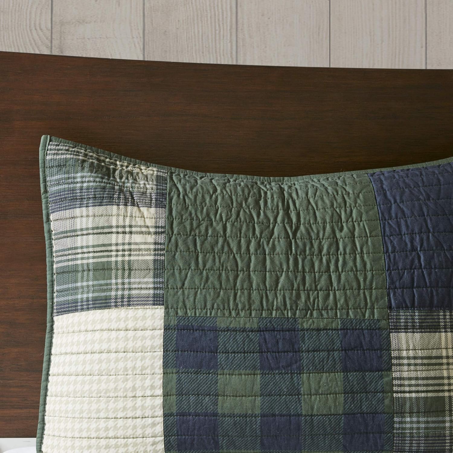- The cotton quilt and matching shams feature a pieced patchwork design, in green, navy, and taupe hues, that elevates your bedroom with an inviting lodge allure.