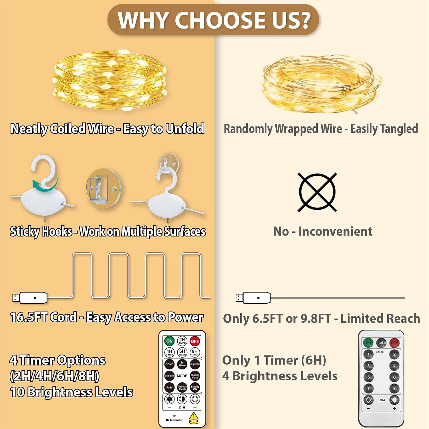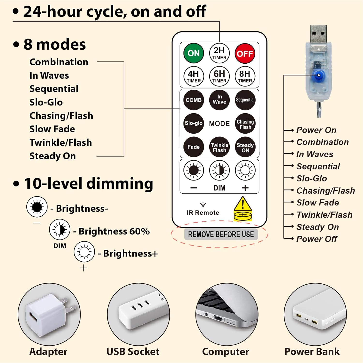 - 8 Modes and Timer: Unlike others, our 17-Keys remote added 4 timing modes (2/4/6/8 hours on, 22/20/18/16 hours off); 8 different flash modes to choose from, and you can adjust the brightness by pressing "dim" ,“+” and "-"; That are all controlled easily with a wireless remote from a distance of 10 to 15 meters, aim at the USB receiving direction when you press; All is in your control