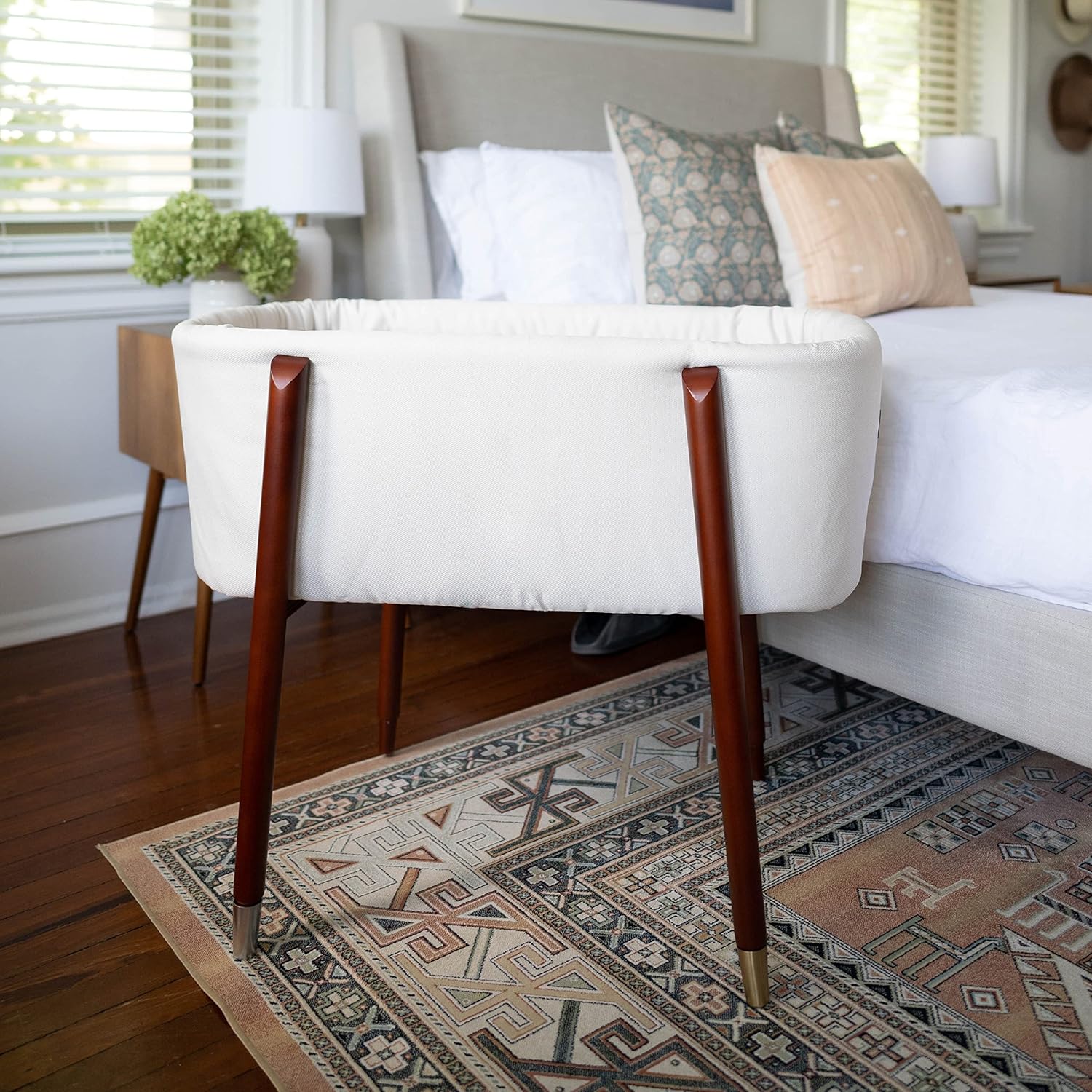 - Stylish Design: Our baby bassinet showcases a contemporary mid-century inspired design, wrapped in premium breathable woven fabrics. The beautifully tapered solid wooden legs are accented with brushed brass tips, adding a stylish touch to your nursery.
