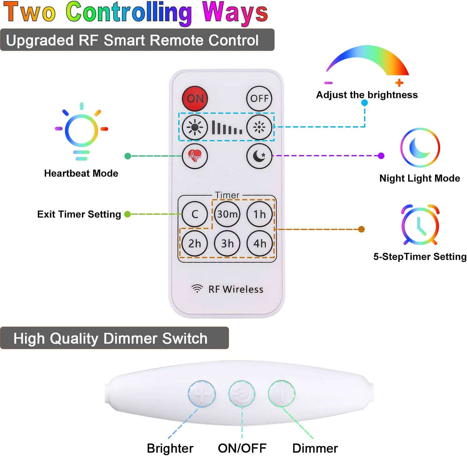 - 🌈【Super Convenient with Remote Control】- This rainbow curtain lights come with a RF remote that allows you to set a heartbeat twinkle mode or night light mode, as well as to adjust the brightness you want, or to set “Timer” from 5 steps: 30m, 1HR, 2HR, 3HR, or 4HR. You can also turn on/off the rainbow led lights and adjust the brightness by the in-line Dimmer switch.