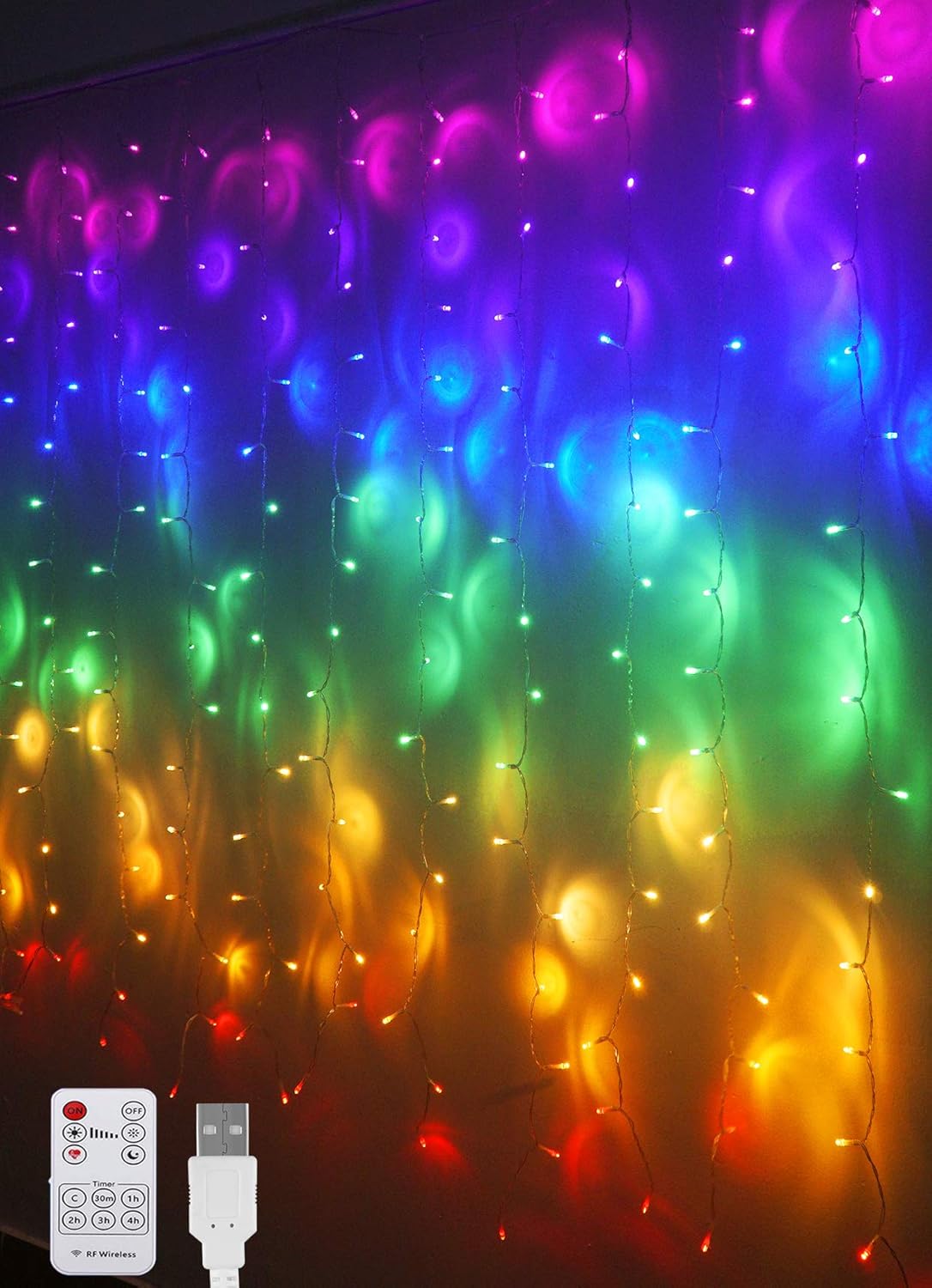Rainbow Fairy String Curtain Lights with Remote, Twinkle LED Icicle Rainbow Lights Curtain for Girls Room, Bedroom, Teen Room, Kids Room, Unicorn Room, Party, Holiday Décor (Rainbow)