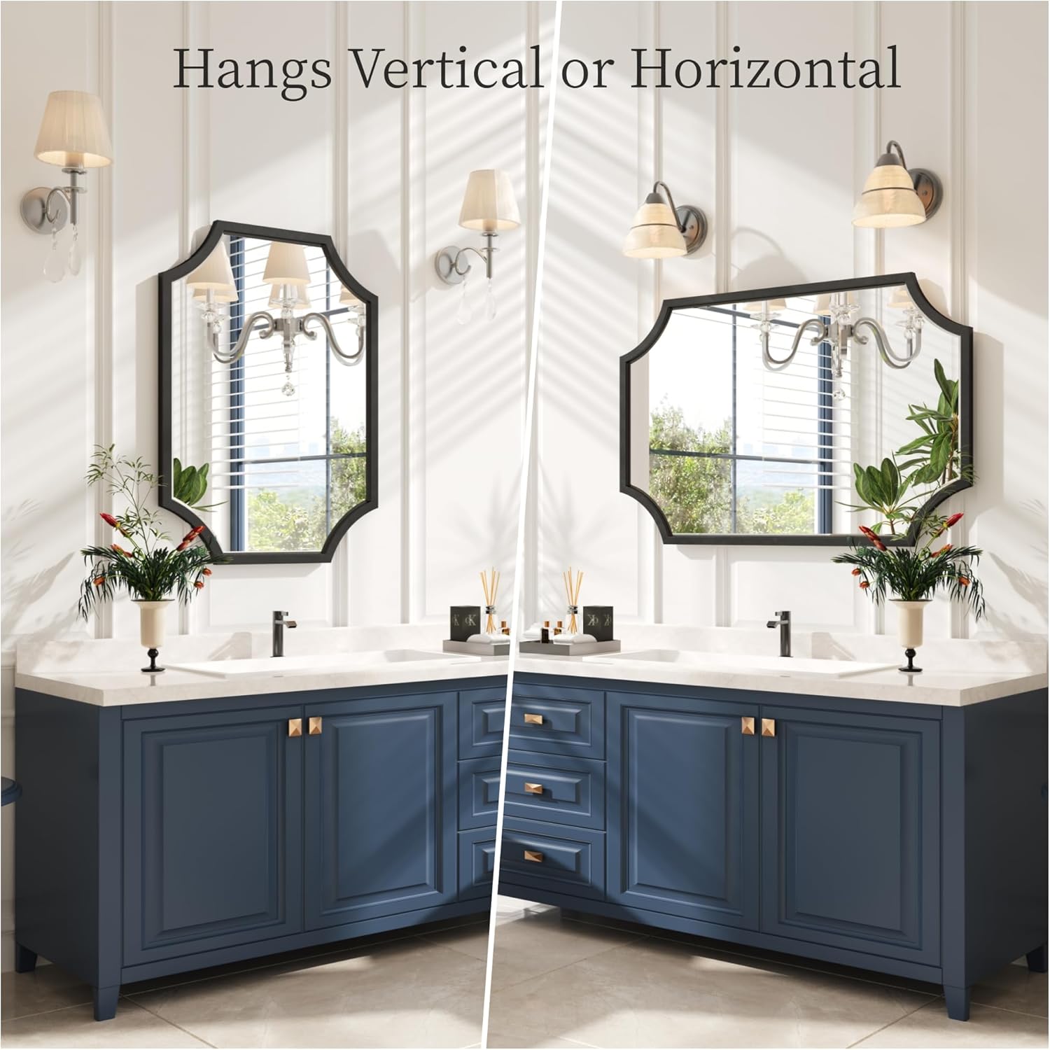 - SOPHISTICATED DESIGN: The mirror frame features an elegant scalloped corner shape. It's a traditional mirror style, but it also gives the mirror a simple and modern look, and it can be placed over a small cabinet or fireplace or hung in your bathroom, living room, dinning room, or kitchen.