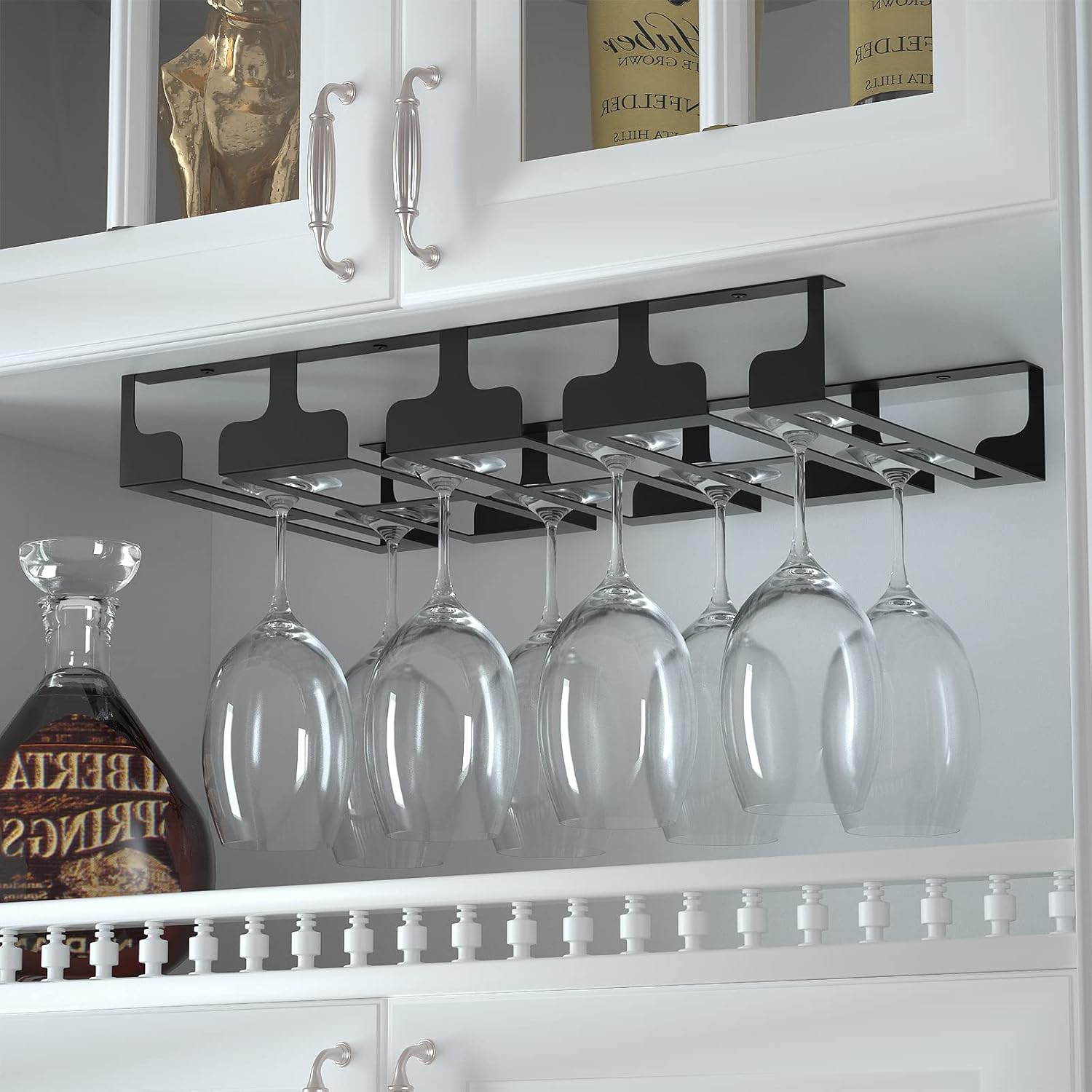- 🍷Space-Saving - Helps you solve limited cabinet space, suitable for burgundy glasses, champagne glasses, cocktail glasses and other glass organizers. You can upside down wine glasses safely and securely, without worrying about them falling, and keep the kitchen bar tidy. The perfect gift for wine lovers.