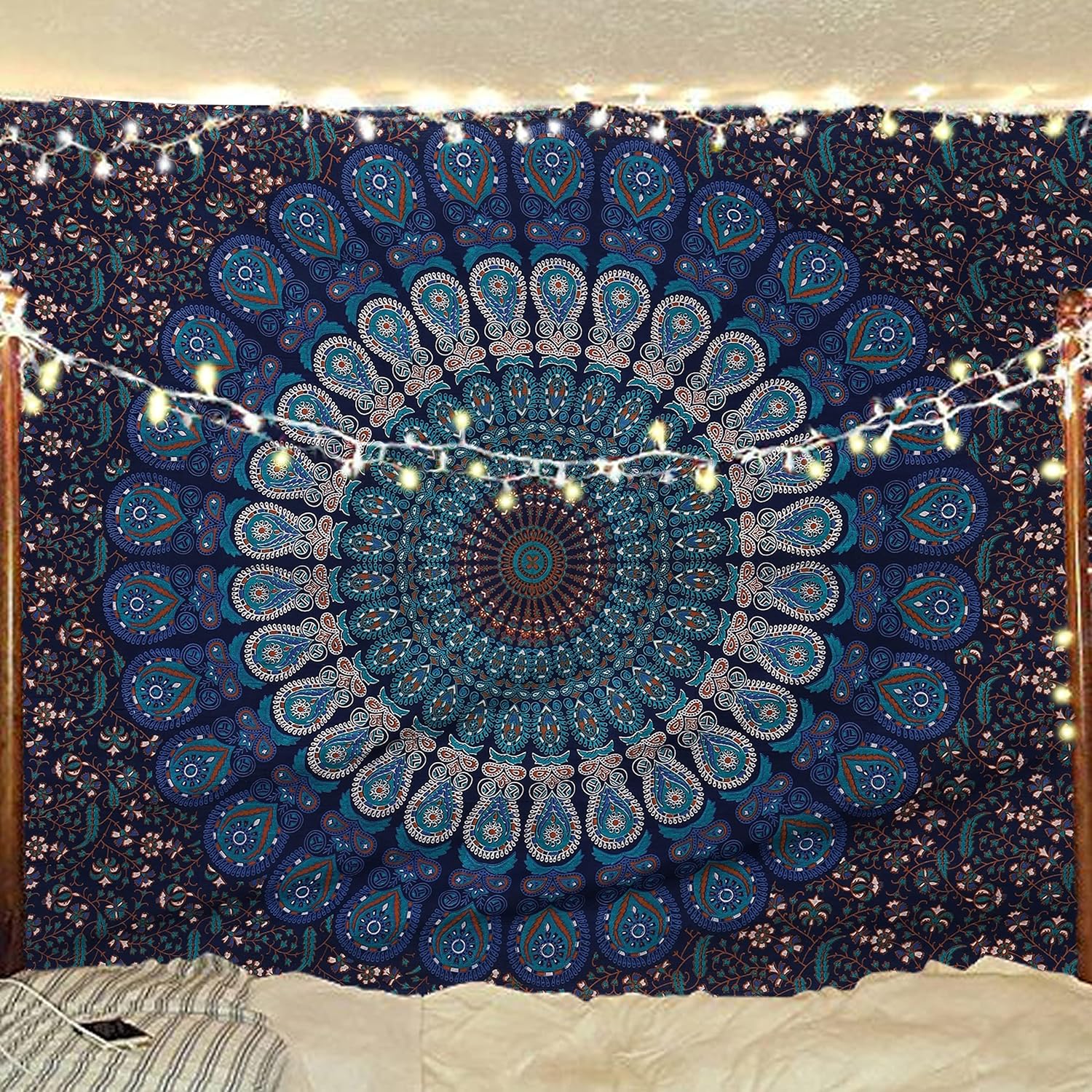 Bless International Handmade Indian hippie Bohemian Psychedelic Peacock Mandala Wall hanging College Dorm Beach Throws Table Cloth Bedding Tapestry (Blue Green, Medium(54x60Inches)(137x152cms))