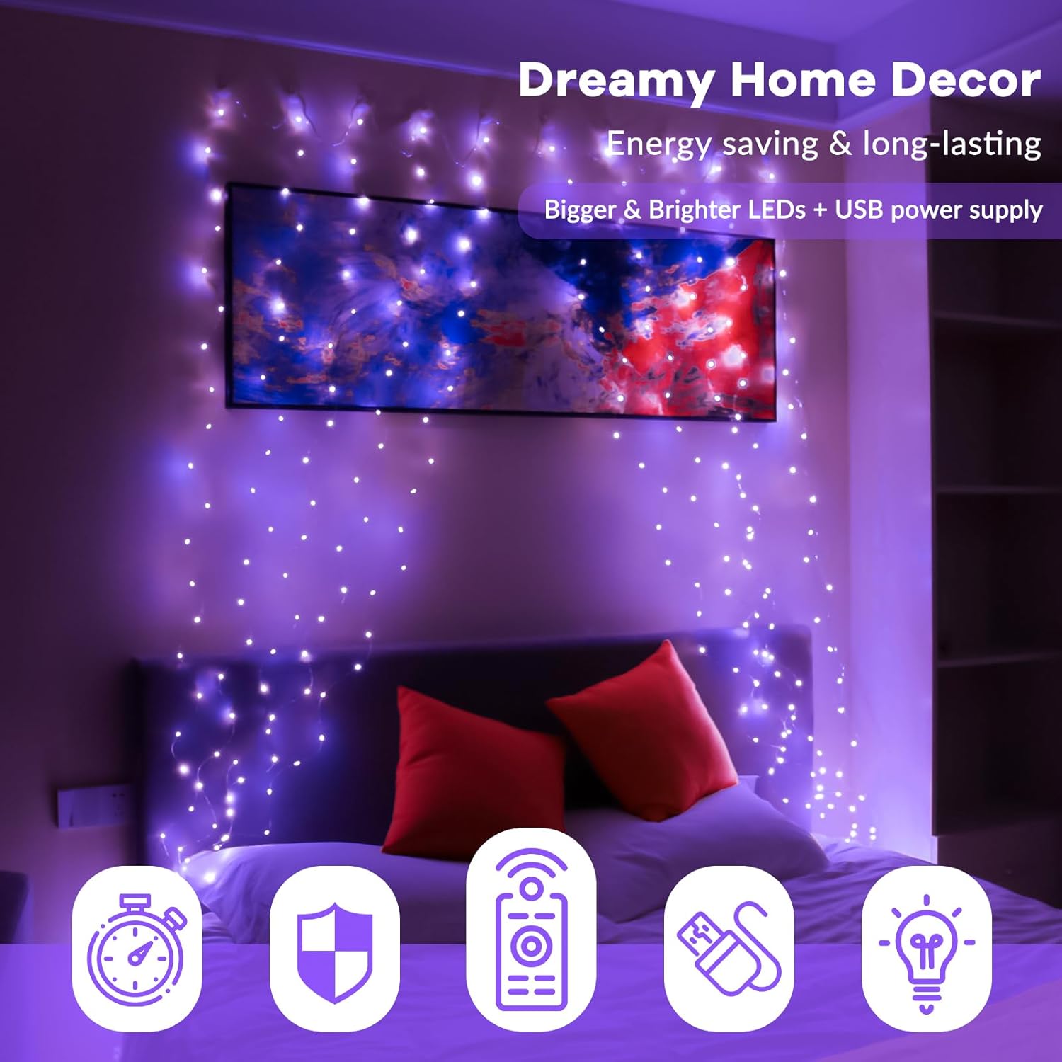 HXWEIYE 300LED Purple Fairy Curtain Hanging Lights with Remote 8 Modes Timer for Bedroom, 9.8x9.8Ft USB Plug in Christmas Fairy String Lights for Outdoor, Weddings, Party, Garden, Wall, Decorations