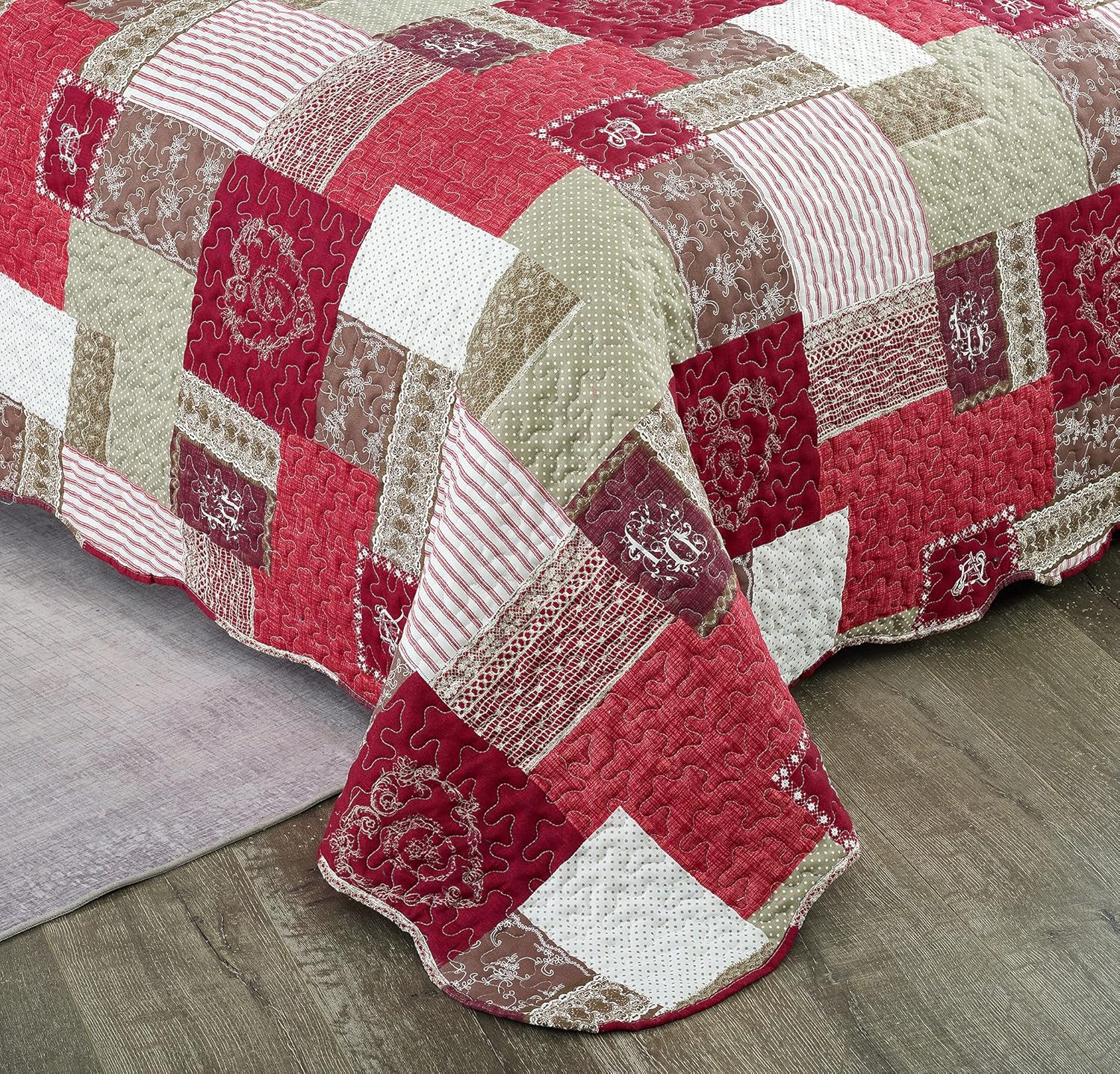 Brilliant Sunshine BurgundyHeart Love, Floral and Lace Patchwork, 3-Piece Quilt Set with 2 Shams, Reversible Bedspread, Soft Lightweight Coverlet, All-Season, Full/Queen, Burgundy