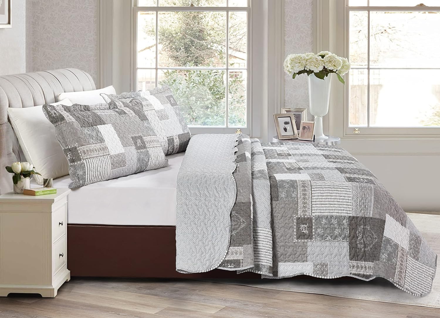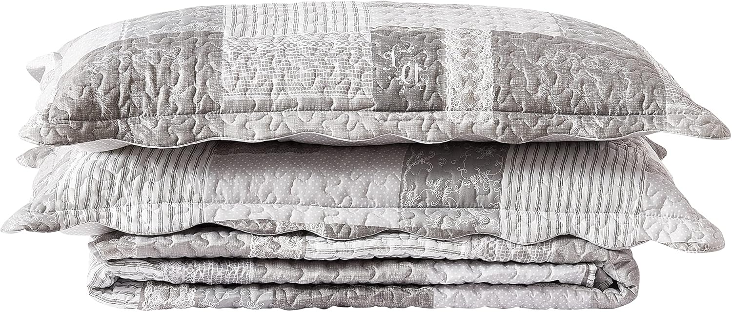 Brilliant Sunshine Grey Heart Love, Floral and Lace Patchwork, 3-Piece Quilt Set with 2 Shams, Reversible Bedspread, Soft Lightweight Coverlet, All-Season, King, Grey