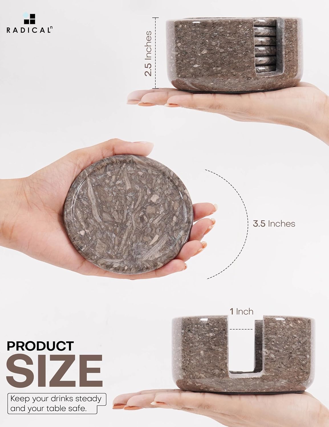 - Set of 6 with Holder Included - Includes 6 round stone coasters with a matching holder for easy storage and display.