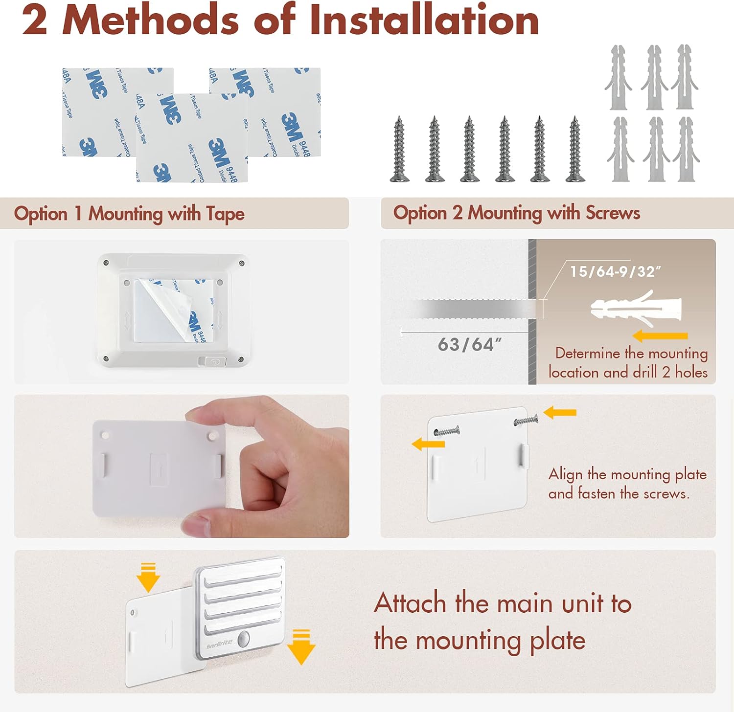 - Easy Installation: 1. Mounting with tape will leave no drill holes in the wall. 2. Mounting with screws: determine the mounting location and drill 2 holes, then put anchors into the holes and fasten the screws.
