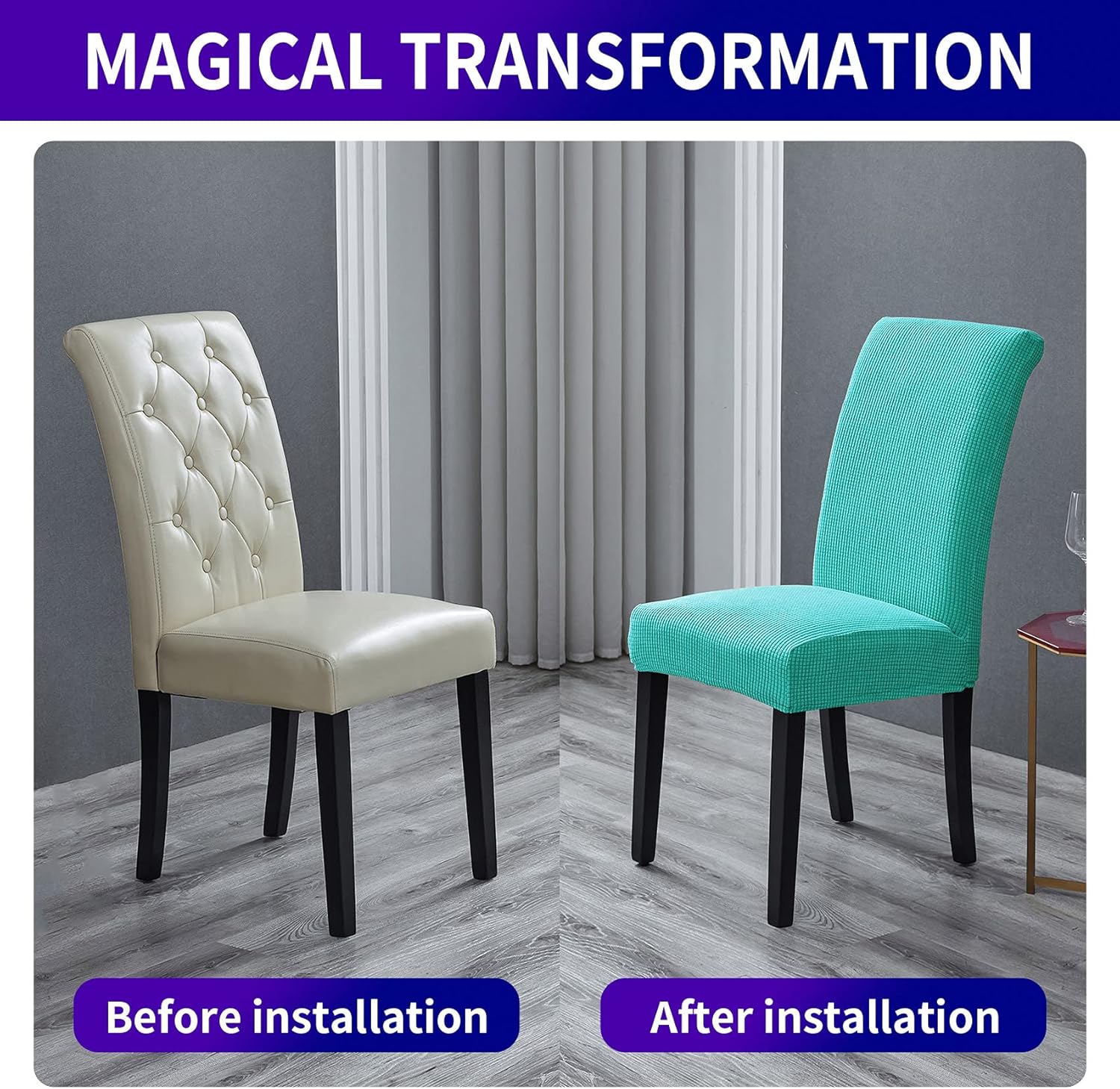 - Easy Installation, simple Care. Easily slip on, instantly transform chairs to a brand new look. Machine washable in cold water, gentle cycle, no bleach, Ironing free.
