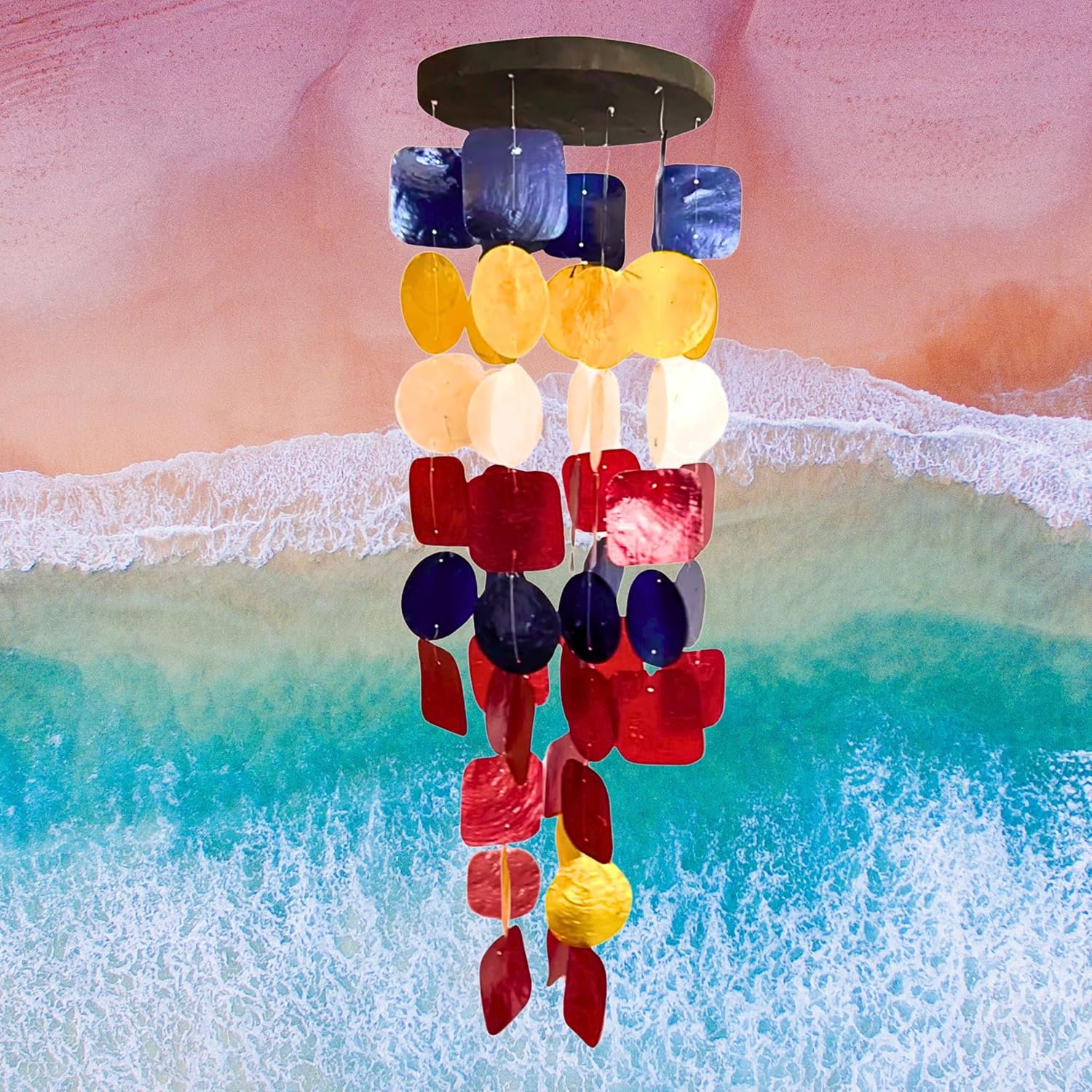 - Unique Wind Chimes: Our colorful outdoor windchimes are strong and long lasting, composed of natural capiz seashells glass, and wood, measuring 27 inches in length.