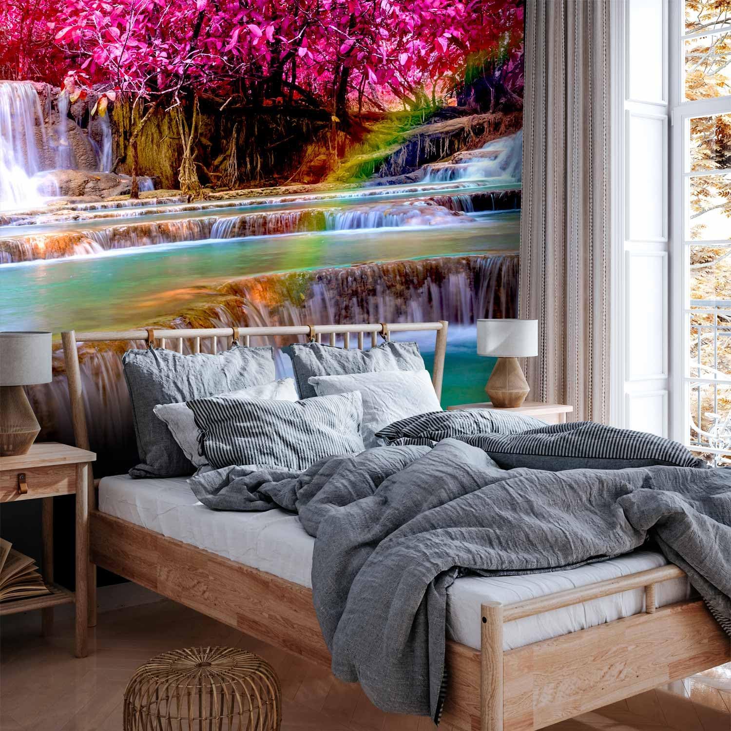 artgeist Wall Mural Peel and Stick Waterfall 212x98 in - XXL Self-Adhesive Corner Wallpaper Removable Large Sticker Foil Angle Wallpaper Wall Decor Print Nature Sun Pink Tree Forest c-B-0474-a-a