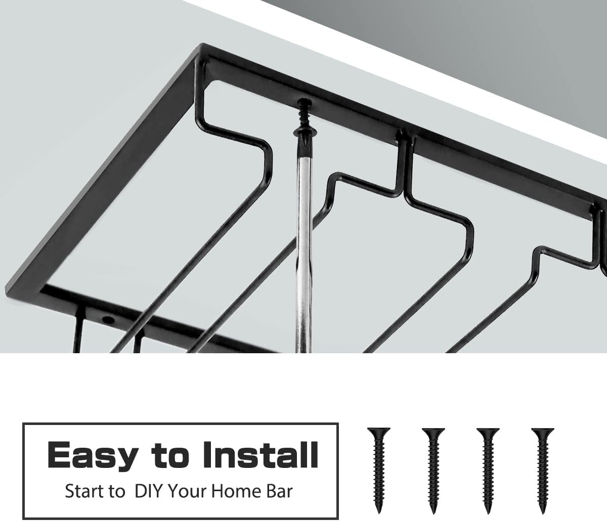 - [Easy to install] - This wine glass hanging rack comes with pre-drilled mounting holes and the screws needed. This rack just takes you a few minutes to assemble and it is easy .What you need to do is using a screwdriver to tighten the screws into the bottom of the wooden cabinet. Ideal for DIY making a wine bar at home or kitchen.