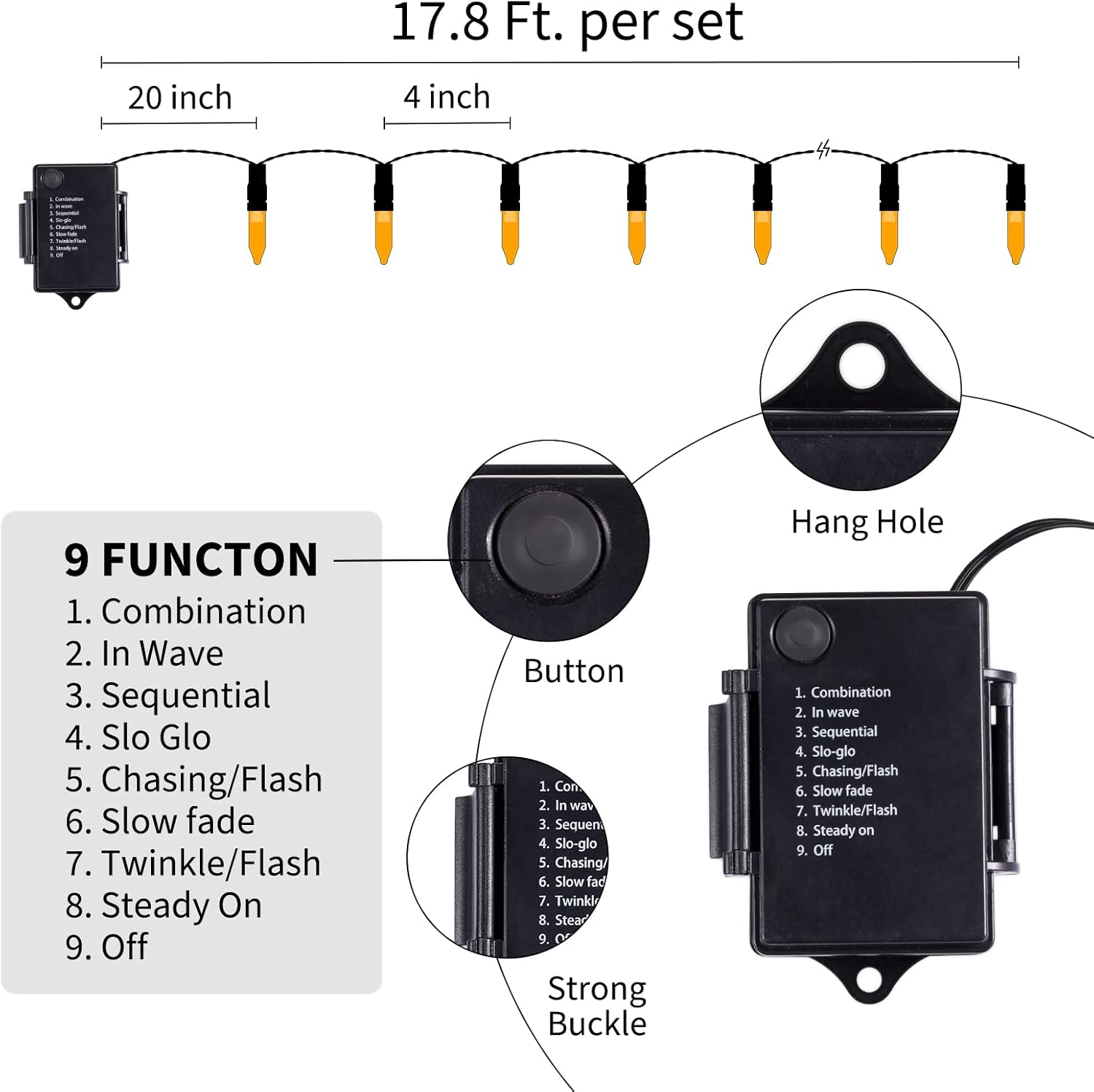 - 8 Preset Modes: Fantastic lighting effects of this Halloween lights, adapting to desired occasions or events: press the button on control box repeatedly to select 1.combination, 2.in wave, 3.sequential, 4.slow-glow, 5.chasing/flash, 6.slow fade, 7.twinkle/flash or 8.steady on