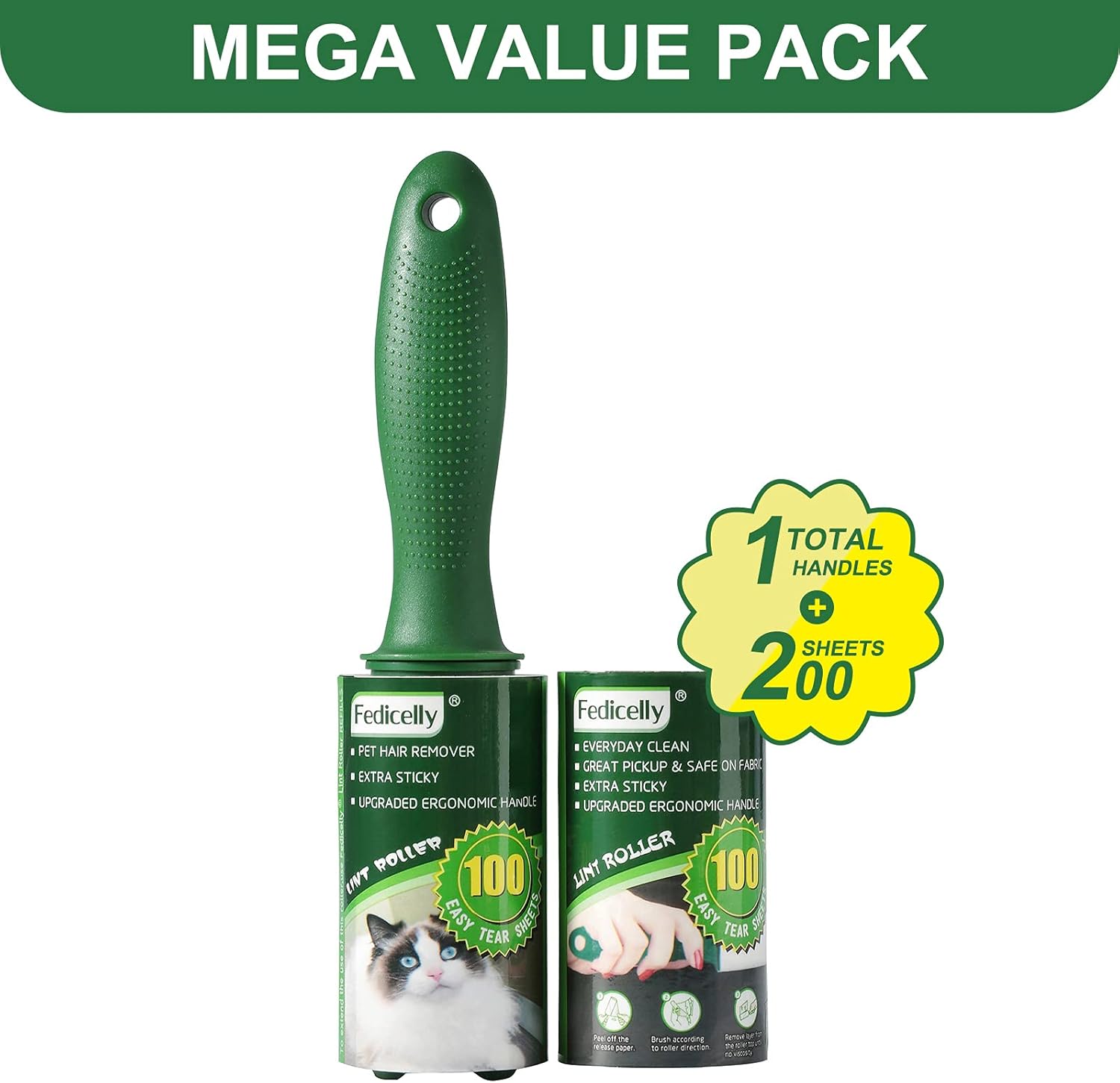 - MEGA VALUE SET 200 SHEETS: This pet lint roller come with 1 upgraded ergonomic handles and 2 lint roller refills, each lint roller refill has 100 Sheets, which is 1.5-2 times that of other similar products, that means you’ll have a total of 200 sticky sheets in stock. Such economical value pack can be long lasting to meet your everyday clean needs. Better quality, higher cost performance.