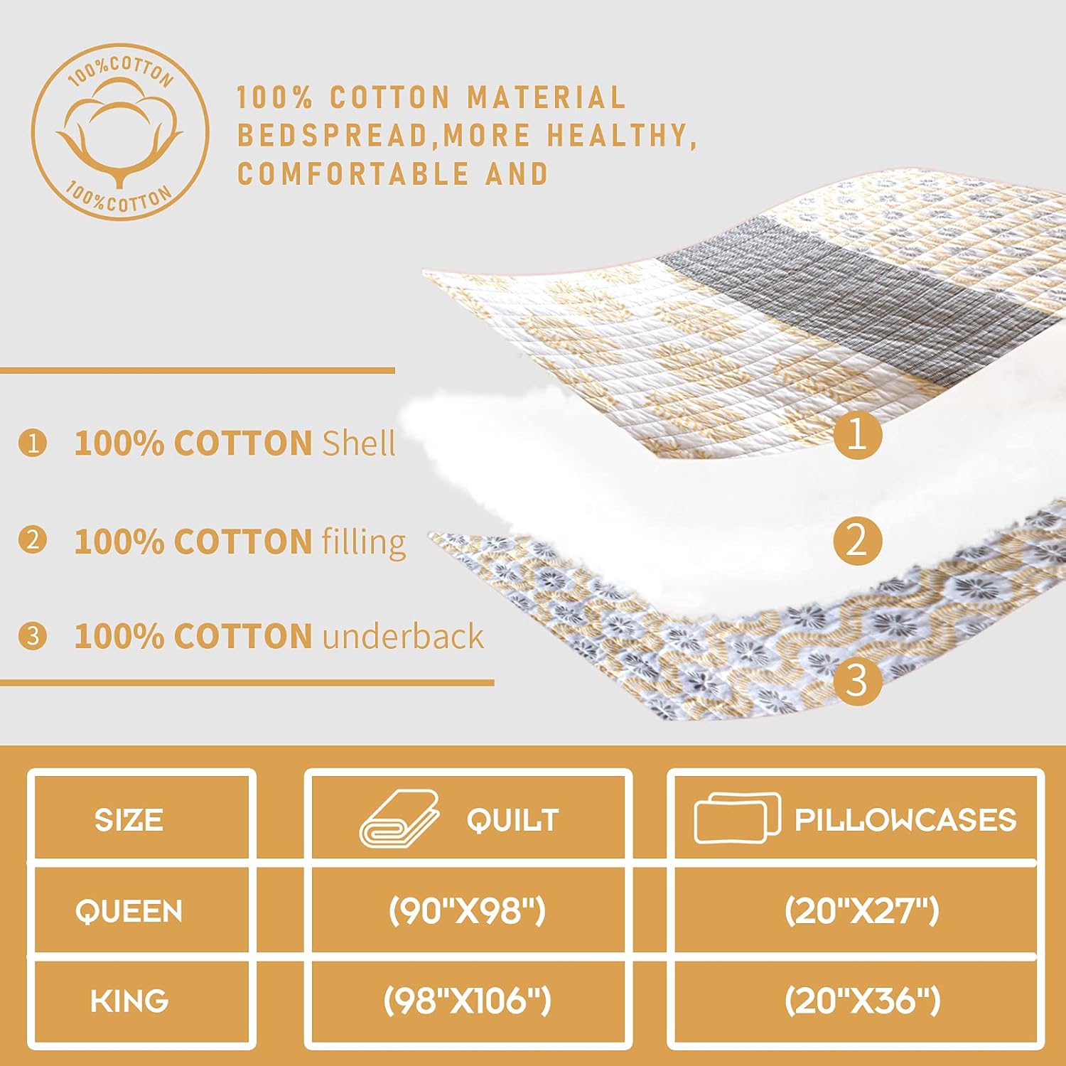 - [100% Cotton Quilt] - 100% natural cotton quilt set,healthier and more breathable.Soft,skin-friendly and durable.