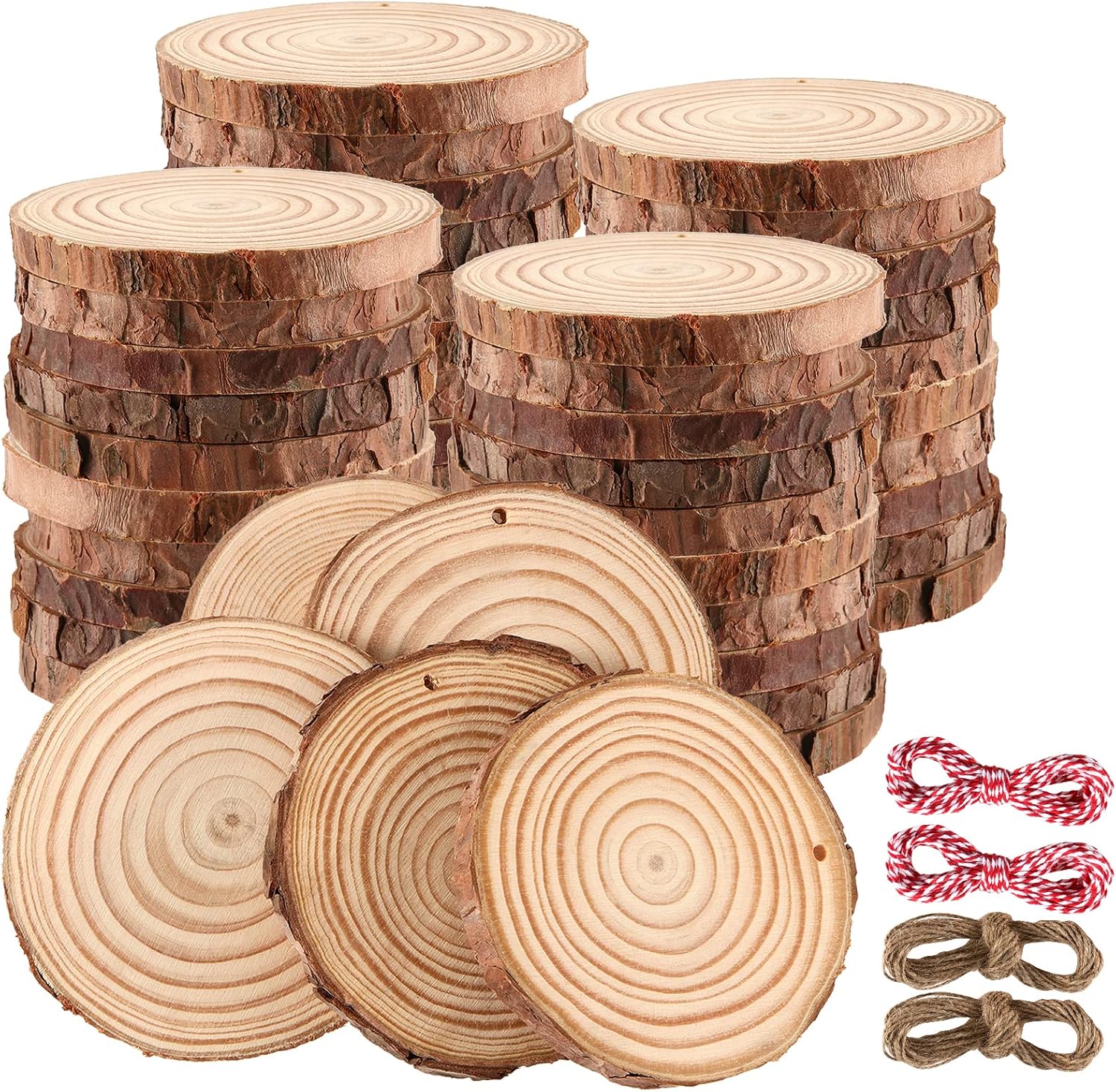 - WHAT YOU GET - You can get 50 pieces of predrilled wood slices. They are pre-cut into 0.4 inch thick wood slices which come in sizes ranging from 3.5-4 inches in diameter. Each of them has been selected from quality wood piece and processed under strict moisture control to prevent drying or cracking. The package also includes 2 pieces of 33ft red/white cotton twine and 2 jute twine for making hanging tags and ornaments.