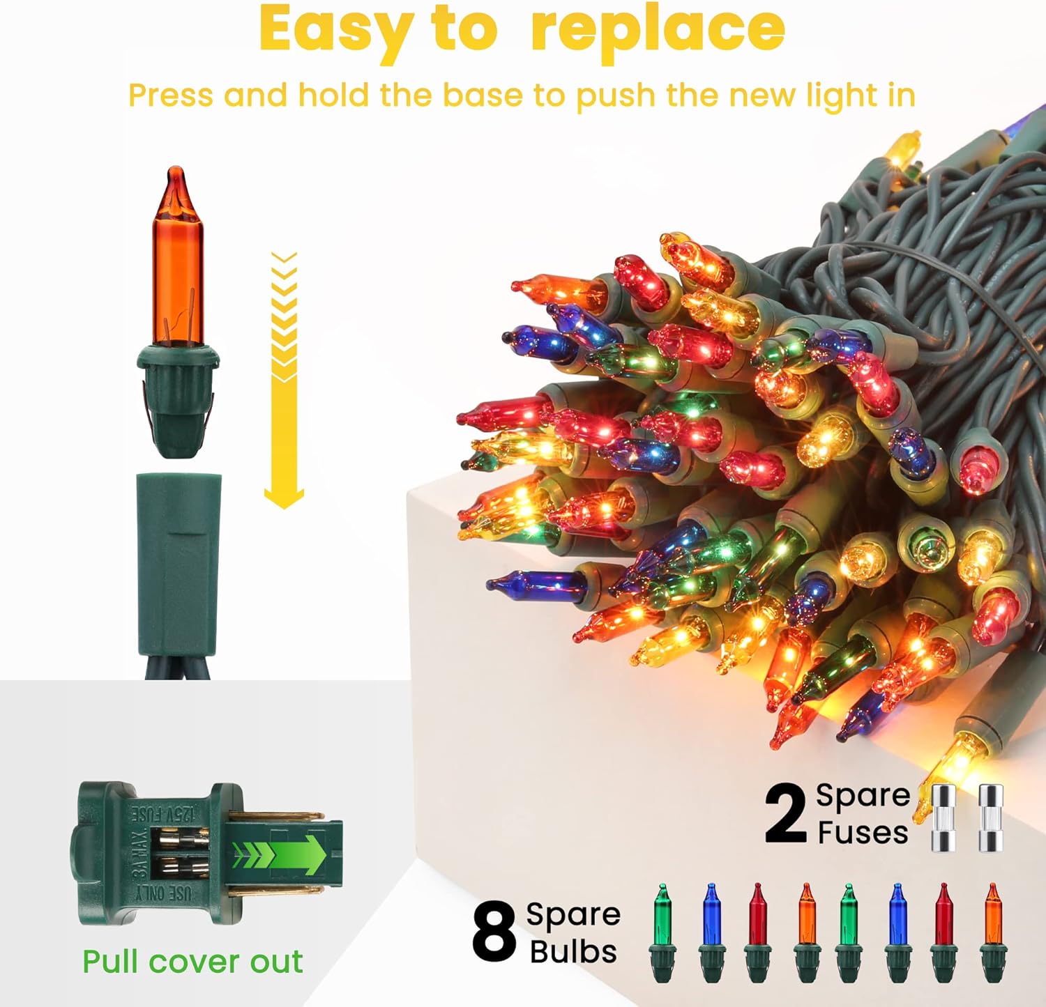 - 🎄 Specification & Quality Customer Service: 300 count mini bulbs, 75ft long strand, the length between 2 bulbs: 3inch. Come with 4 spare bulbs and 2 spare fuses. Toodour provides 30-day money-back and 12-month replacements. If you have any questions, please feel free to contact us.