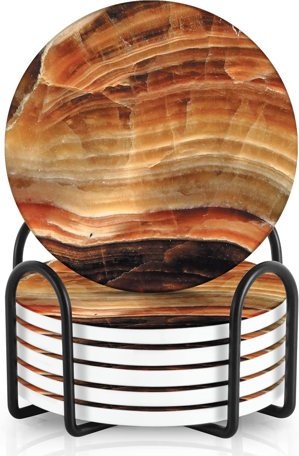 - ✅ ABSORBENT – Our moisture absorbing coasters are great for wine, tea, are stain resistant and scratch proof. Complement your coffee table with our iron stand and modern coasters that are thick enough to absorb water, liquid, moisture, yet thin enough to blend in perfectly with your decor. The coaster set combines the great marble stone style design with fast liquid absorbency for drinks.