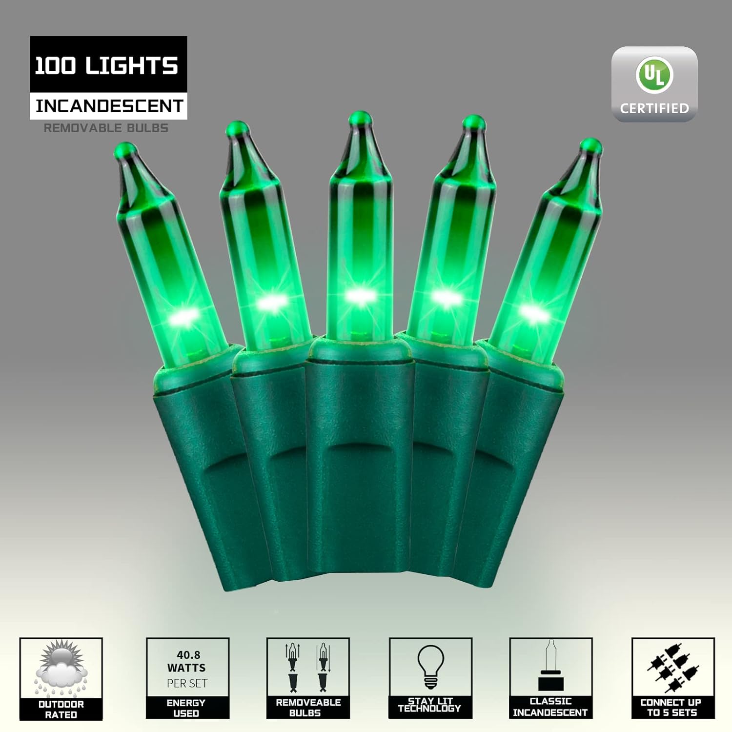 - Safty and Easily: High quality UL certified products ensure the safety of you and your family, Decorate with 100 green incandescent mini lights with green wire will give a soft festive feel to your Christmas.