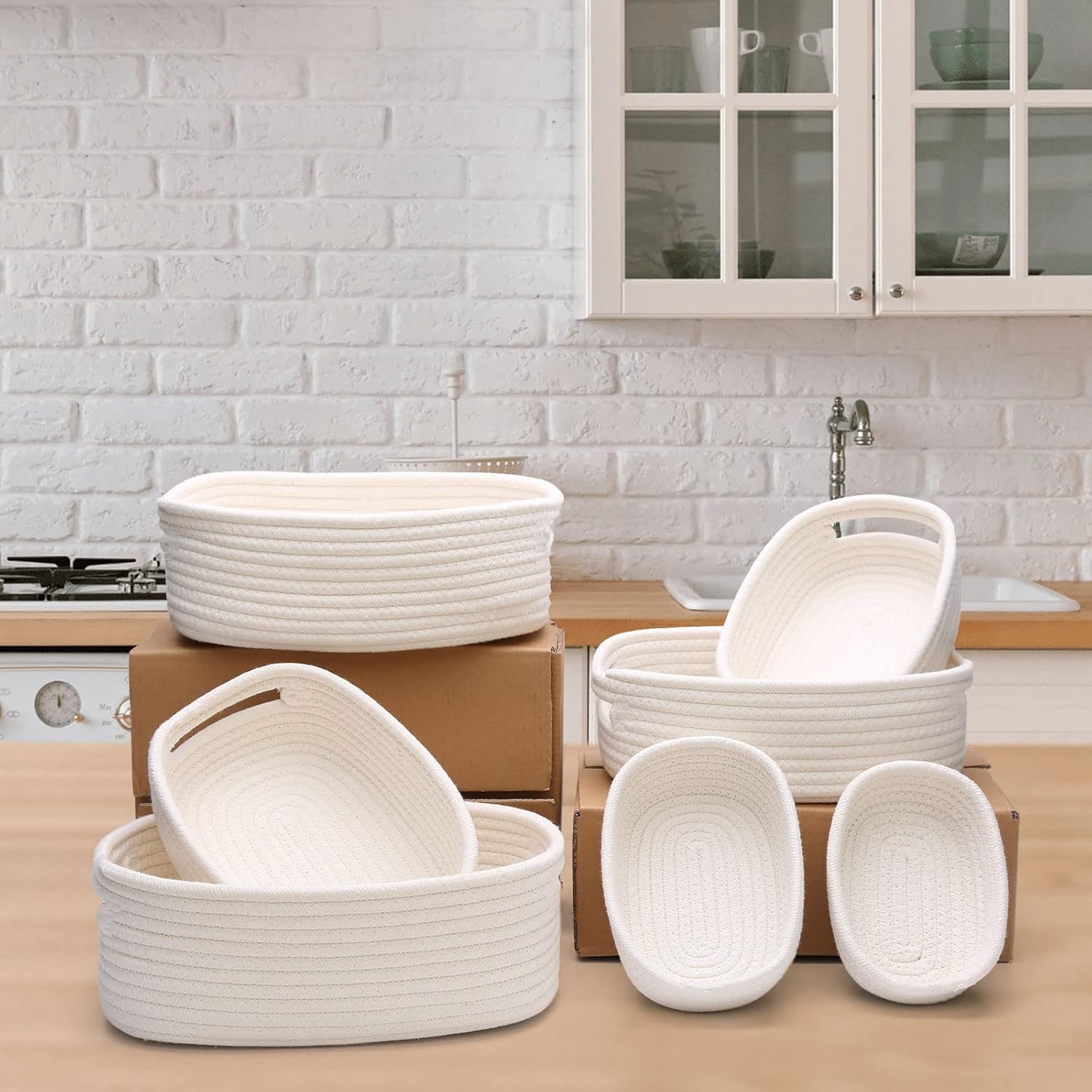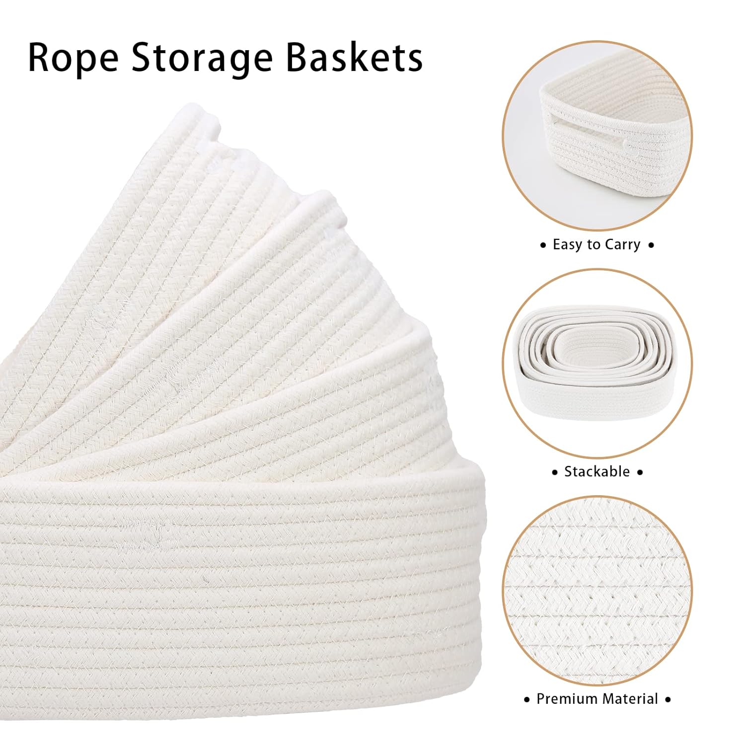 7 Piece Cotton Rope Woven Basket Set - Small Basket for Baby Nursery, Pets, Montessori, Dog & Cat Toy Boxes, Bathroom Organization Bins (White)