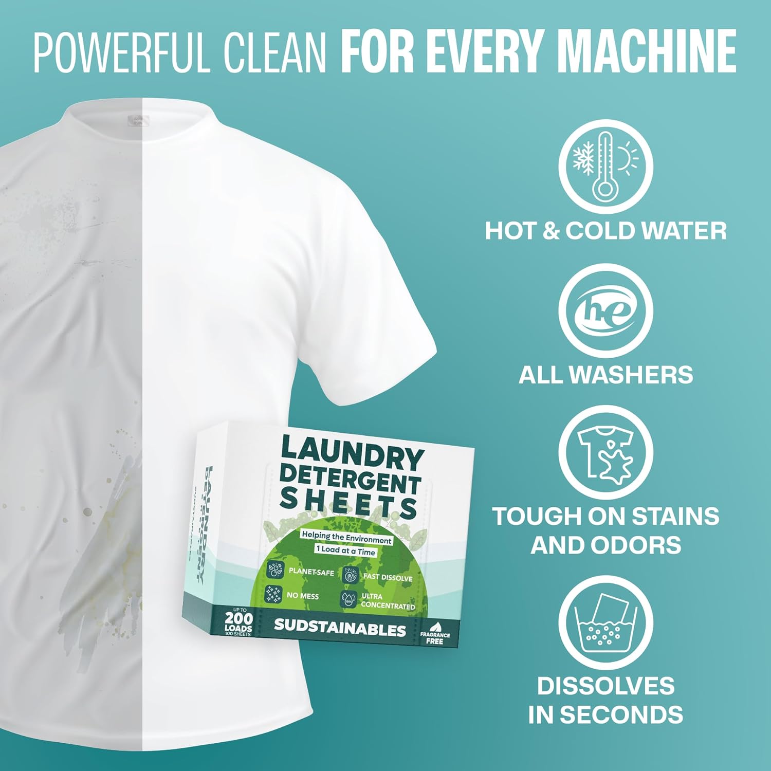 Sudstainables Eco Friendly Laundry Detergent Sheets - (200 Count), Unscented, Zero Waste, Plastic Free, Ultra Cleaning Strength, Sensitive Skin Safe, Saves Space