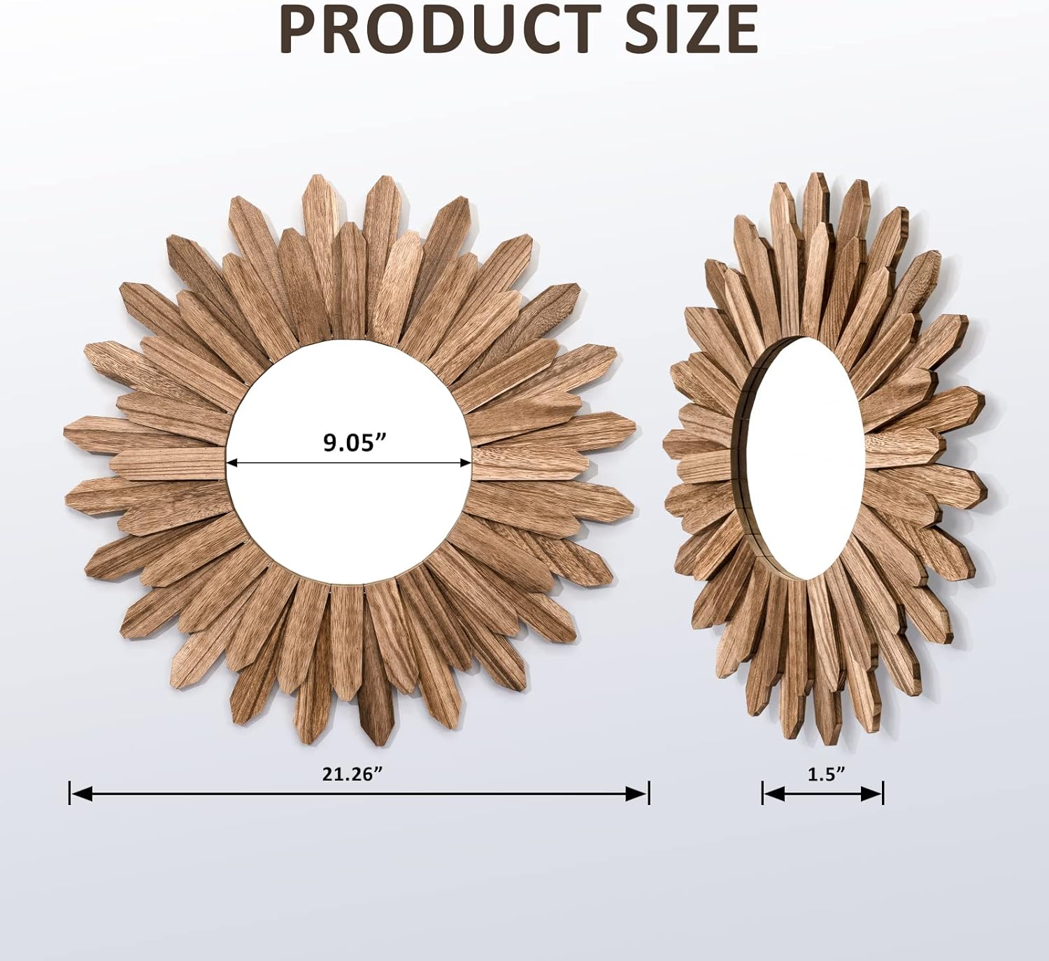 - Easy to Hang: Measure at 21 inch diameter with wood frame and diameter of 9 inch for mirror; Hang this stunning mirror in your bedroom over your bed, in your hallway or entryway, over your living room sofa.No any assembly, quite easy to hang on the wall; Comes with anchor and screw