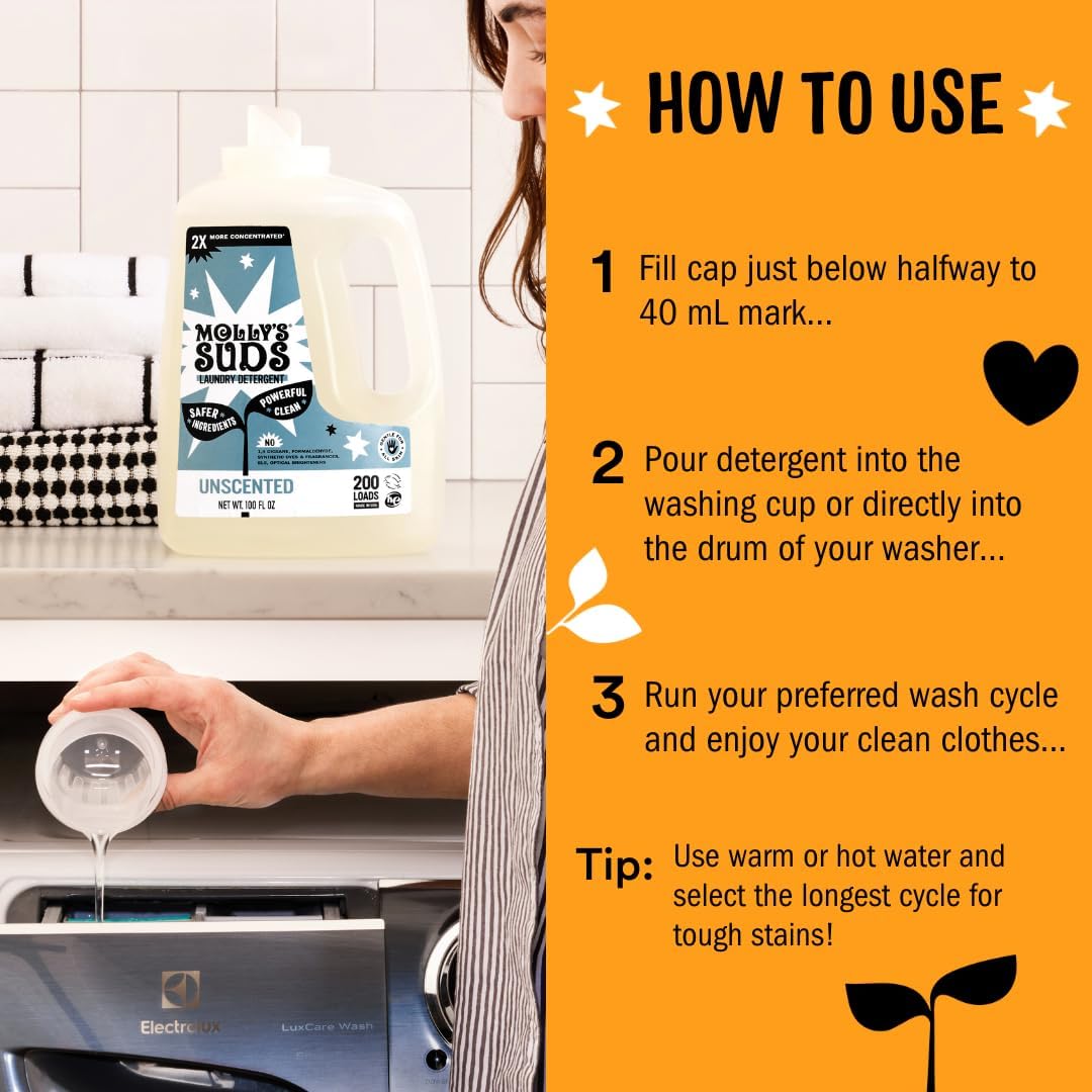 - Developed by a pediatric nurse & mom and made with simple, effective ingredients, Molly's Suds harnesses the power of plant-based surfactants and active enzymes to deeply penetrate fibers, removing soil, dirt, oil, and stains with ease.