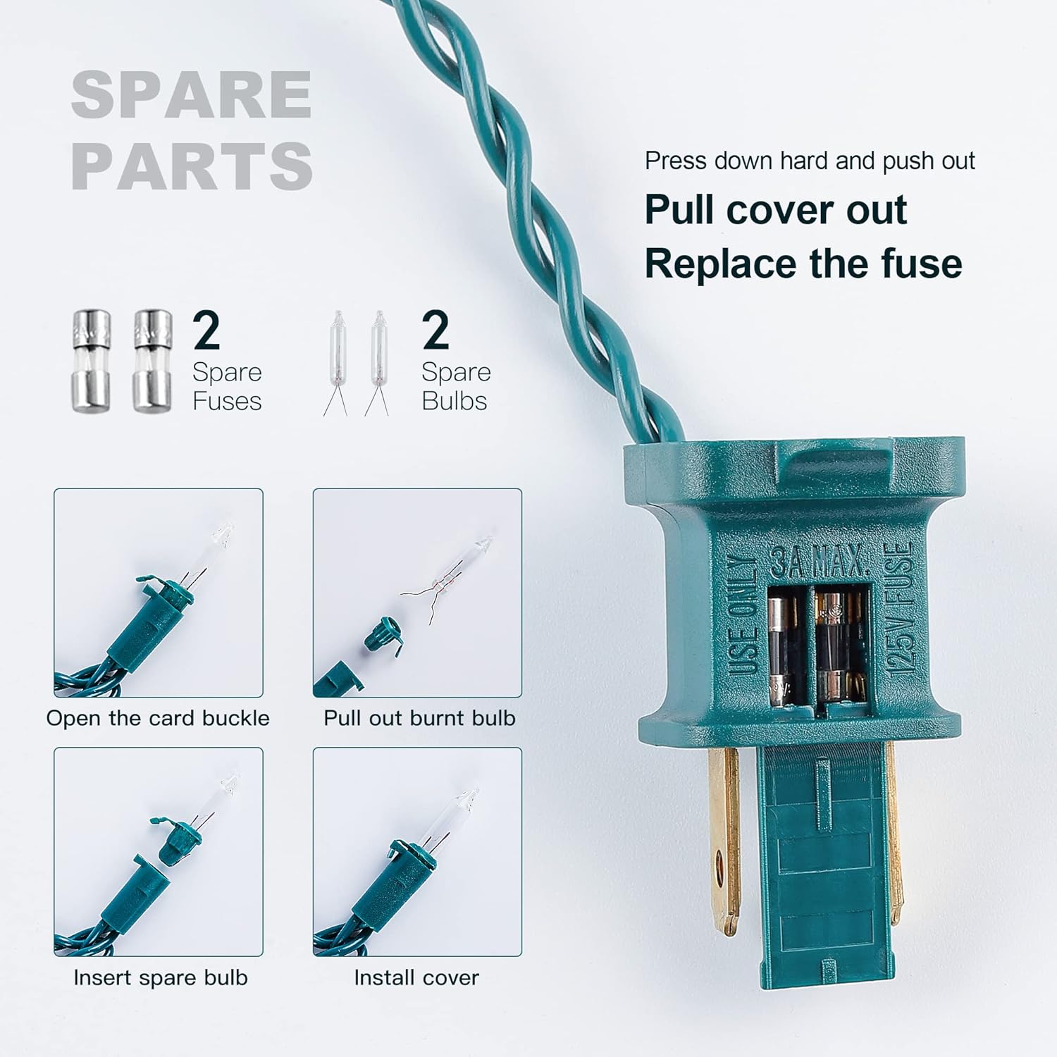 - 🌲Unique Design Christmas Lights: The bulb has a snap-on design and is very easy to replace. When one of our bulbs breaks, it doesn't affect the other bulbs. This is a very special design. You can replace damaged bulbs individually with the spare bulb or fuse provided by us.