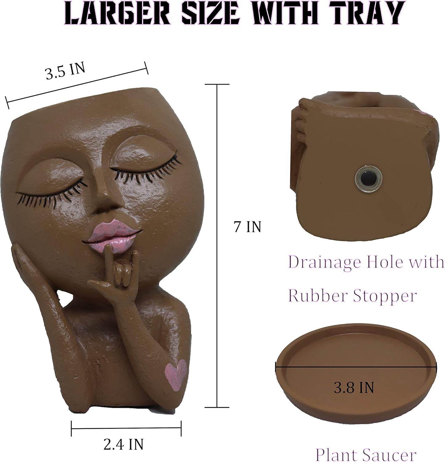 - 🌵 Size of Planter Pots: The size of this unique head vase is carefully designed by us. Based on sociology and aesthetics, we found this size to be the perfect way to make this vase funny and cute. The opening diameter of the flower planter is 3.5 inches, bottom length is 2.4 inches, height is 7 inches. The Diameter of the tray is 3.8 inches.