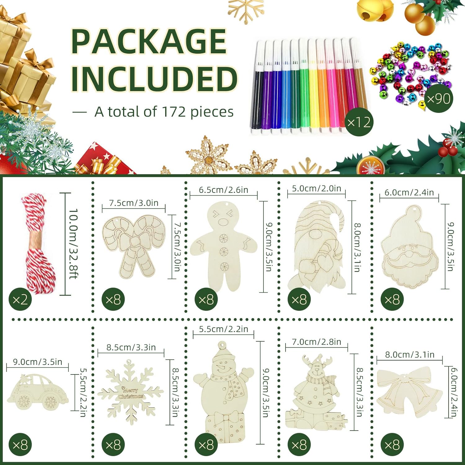 Wooden Christmas Ornaments, 176 PCS Unfinished Predrilled Wood Ornaments Set with 72 Blank Wood Slices in 9 Styles, 90 Bells and 12 Color Pens for Kids DIY Crafts and Christmas Hanging Decoration, A
