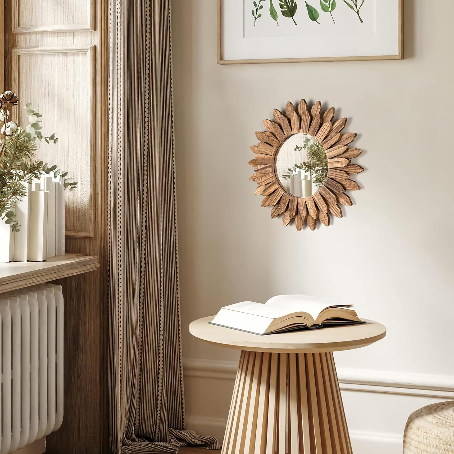 - Boho Wall Decor Mirror: The design of wood sunburst base on the element of boho style, it will be a nice touch and goes well with your others boho decor style; decent decorative piece with perfect size for wall mounted or lean on wall at desk, perfect for your bedroom, living room, bathroom, kitchen and more