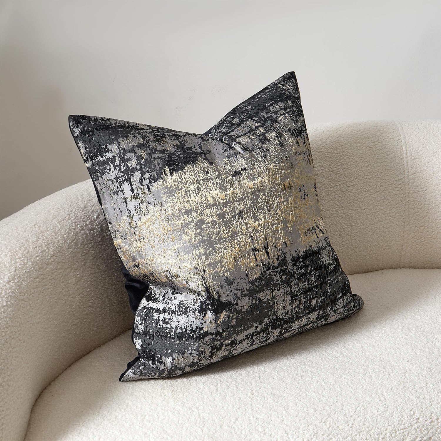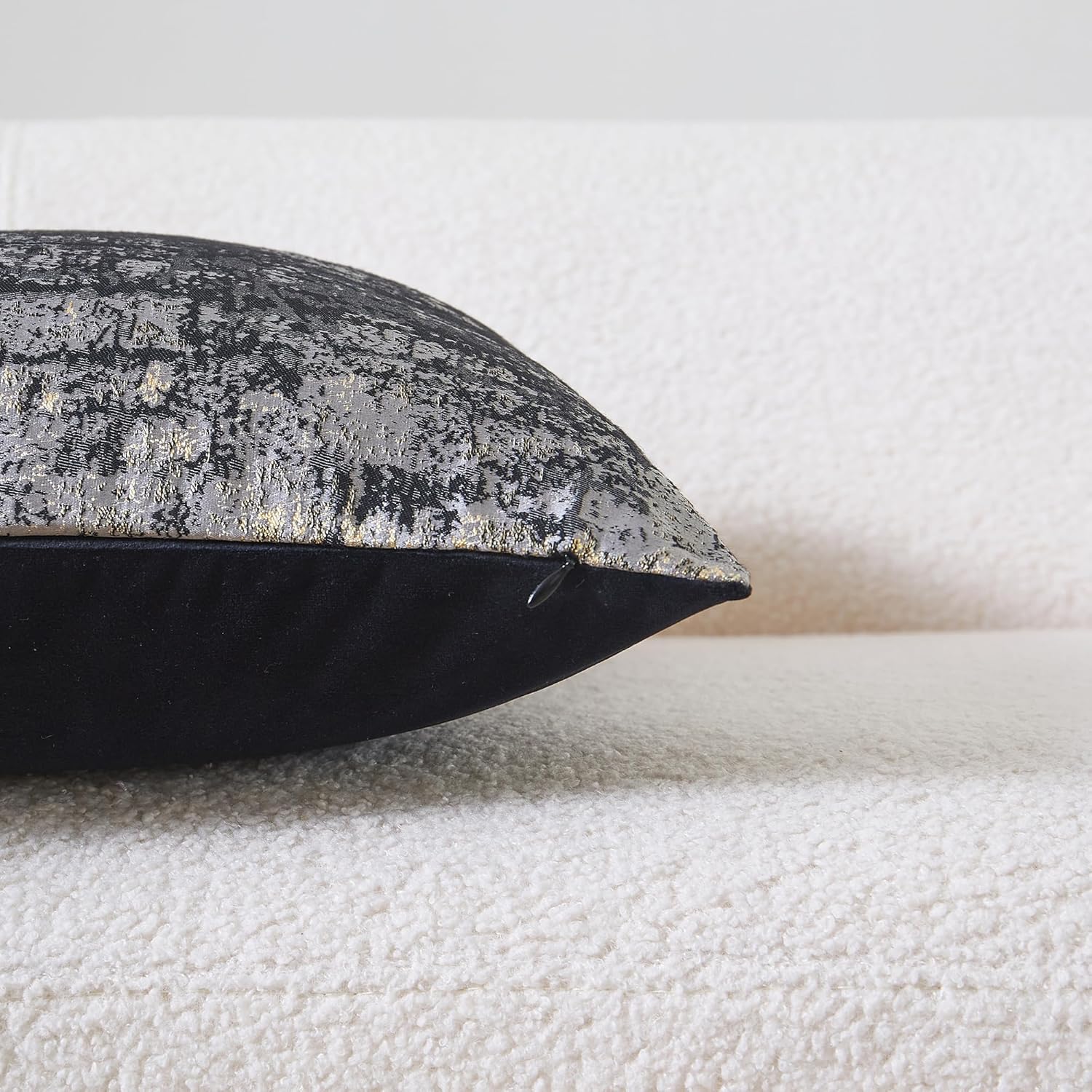- Premium Jacquard & Velvet Pillow Cover : Crafted with 70% polyester 30% viscose jacquard weave (front) in grey-black with woven gold threads that catch the light, creating a subtle metallic glow. Reverses to 100% polyester black velvet (back) for cloud-like softness. Two looks in one—instantly elevate your sofas, beds, or accent chairs.