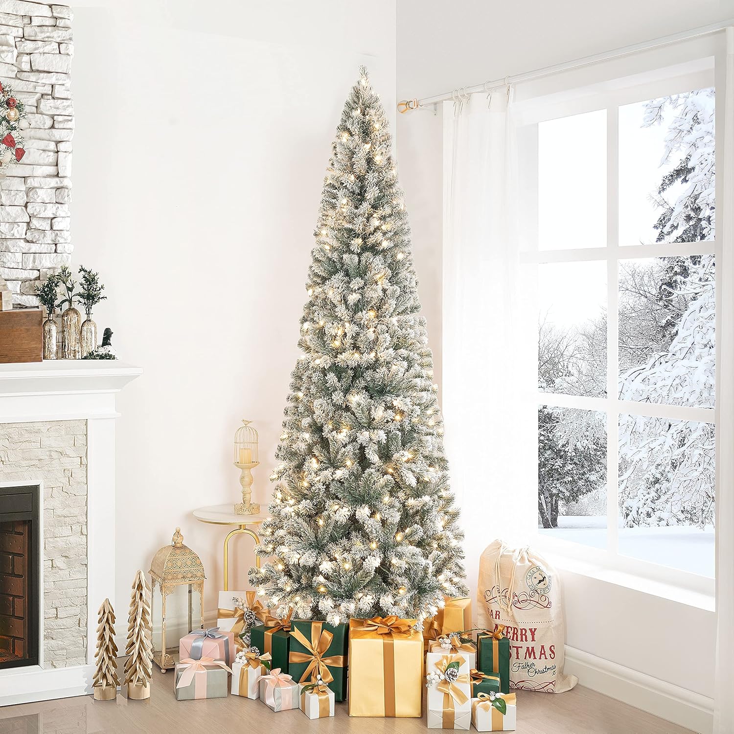- SLIM, MODERN & FROSTED :Our Salzburg Frosted Slim Pre-Lit Artificial Christmas Tree is an all-around unique gem. The Pencil Tree will catch the attention of all your guests! The Salzburg Thin Christmas Tree also features Frosted Tips for that feel of winter whereever your home is.The Flocked Christmas Tree Prelit with lights is the perfect conversation started during your Christmas party. Arbol de Navidad con luces.