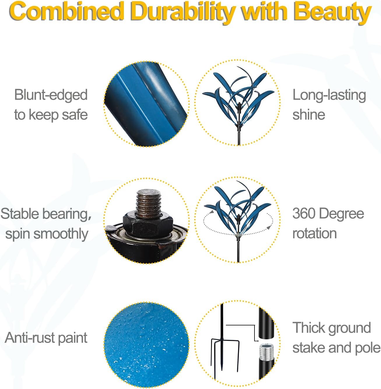 - 【Withstand All Weather】Stable pronged base stake design to keep the outdoor large wind spinner balanced and firmly placed. Hand-painted and UV treated to resist fading, so it is long-lasting and will perfom well as a garden decoration.
