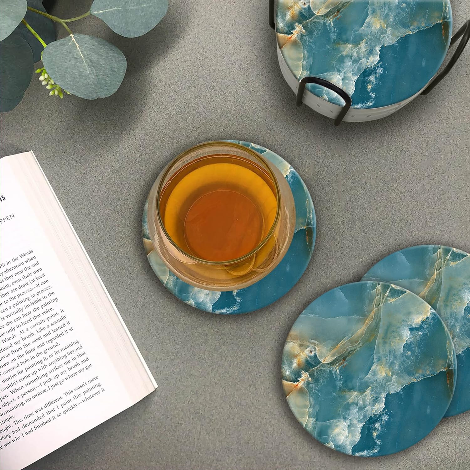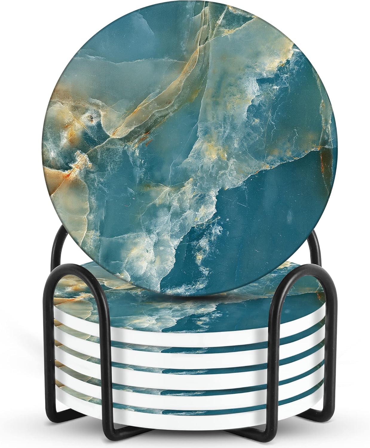 Emerson Coasters for Drinks Absorbent – Natural Stone Drink Coasters Set with Holder, Coasters for Coffee Table, Wooden Tabletop Protection Marble Style – 100% Heavy Duty Set of 6 (Seaside)