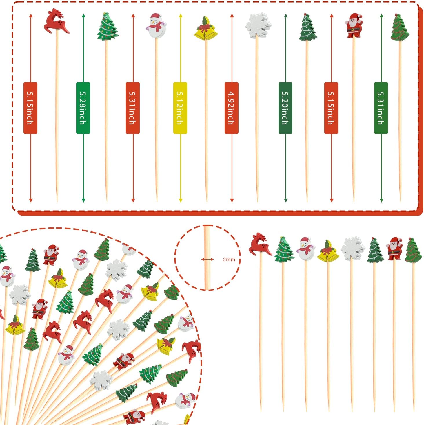 Christmas Cocktail Picks Toothpicks Fruit Dessert Sticks Food Sandwich Appetizer Charcuterie Skewers for Xmas Tree Snowman Elk Snowflake Christmas Decorations Themed Party Supplies, 5", 100 Count
