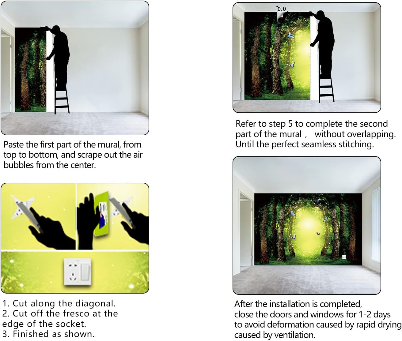 - It's easy to install: at the bottom of each mural we have a numbered sequence, You can refer to the instructions we provided and the main picture 6-7,just match the numbers and you'll be amazed!