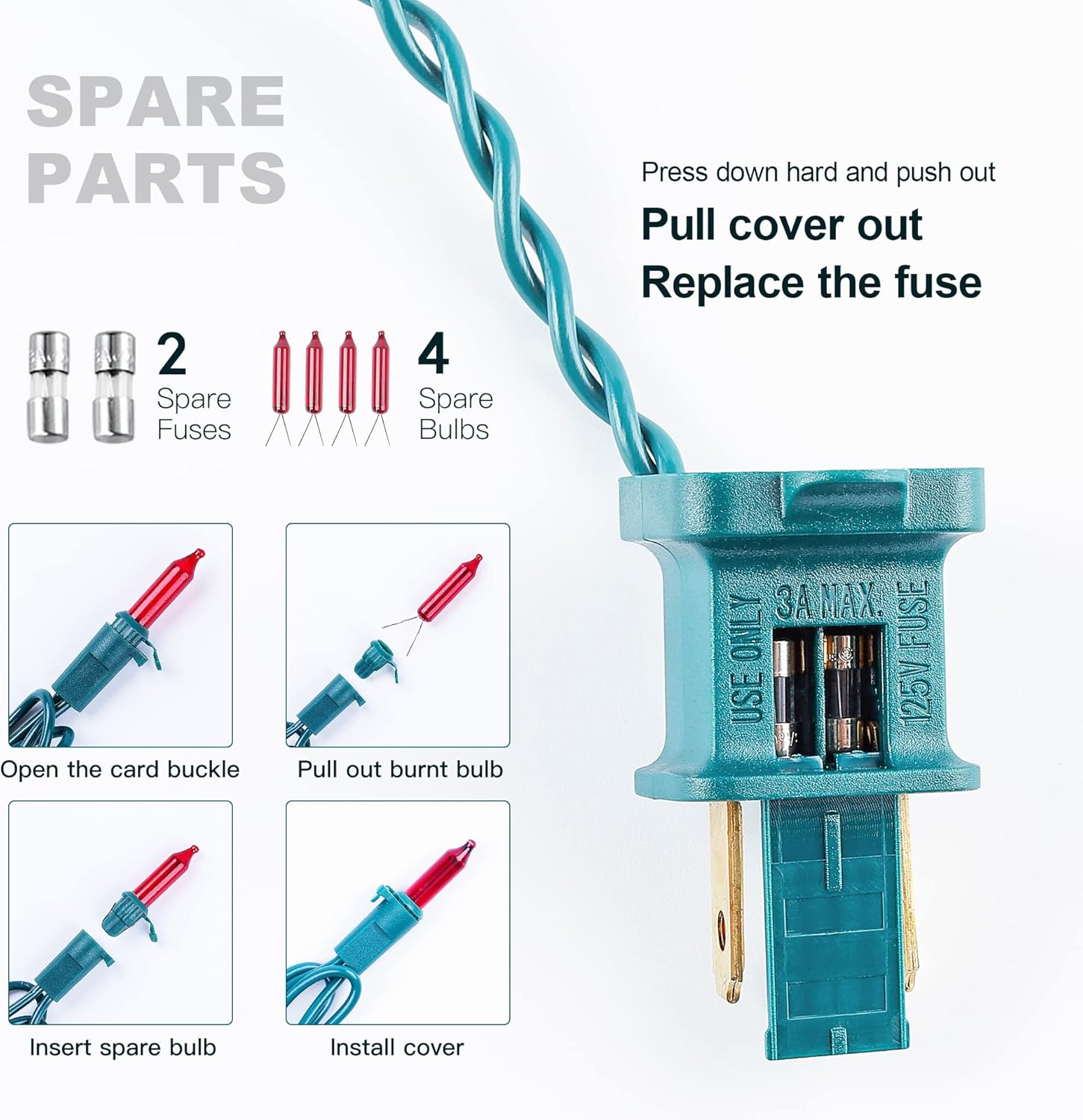 - 🎀Unique Design Christmas Lights: The bulb has a snap-on design and is very easy to replace. When one of our bulbs breaks, it doesn't affect the other bulbs. This is a very special design. You can replace damaged bulbs individually with the spare bulb or fuse provided by us.
